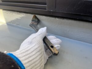 外壁・2Fベランダ床面・上塗り仕上げ、トップコートグレーの刷毛塗り施工です。