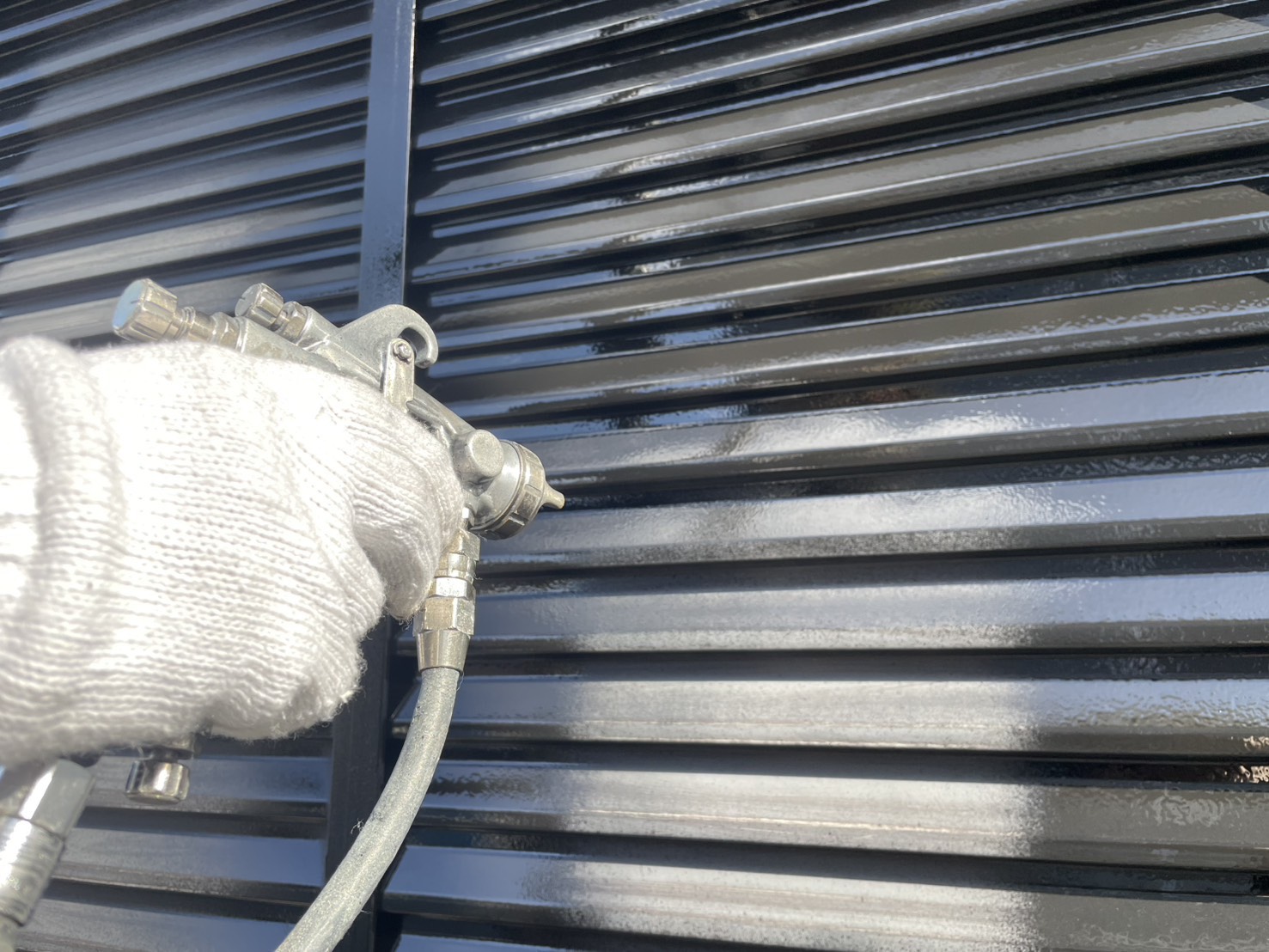 外壁・戸袋の吹き付け施工:上塗り仕上げ、エスケープレミアムルーフSiブラックの施工です。
