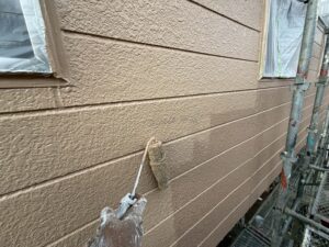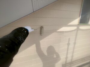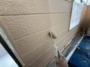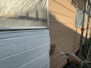 外壁・1F壁面・上塗り仕上げ:エスケープレミアムシリコンラジカル塗料(SR-411色)のローラー塗り施工です。