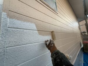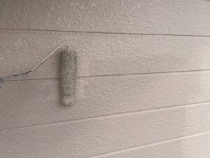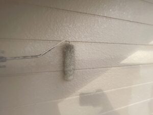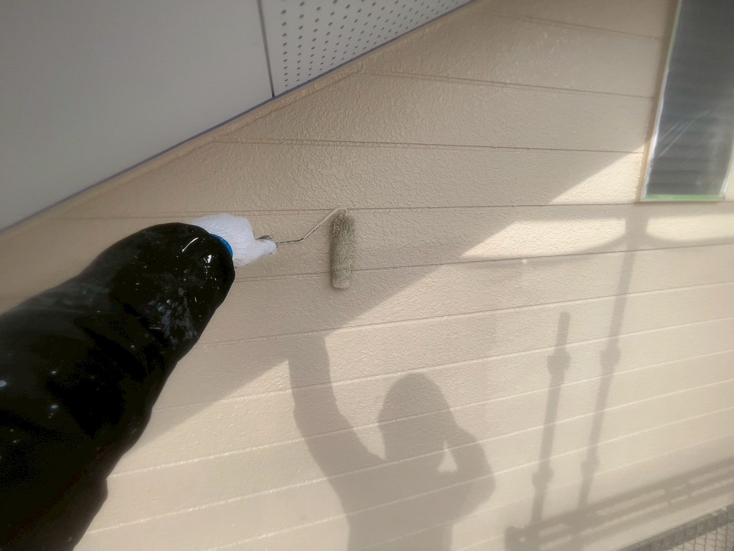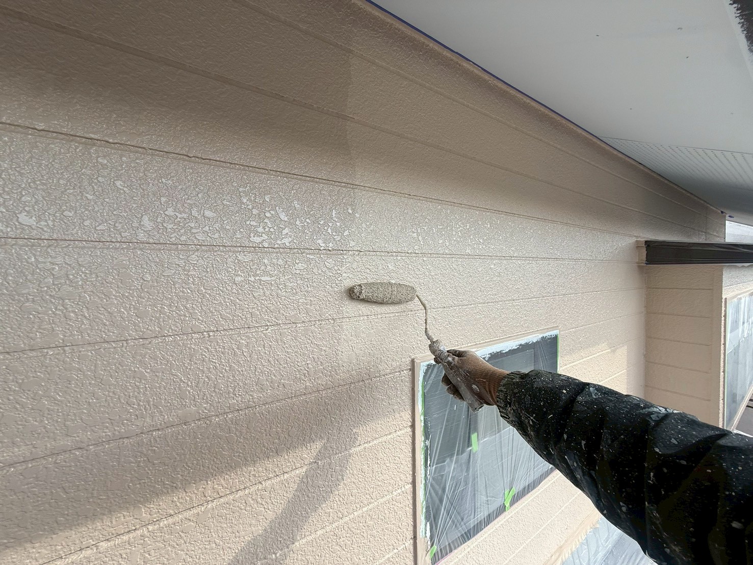 外壁・1F壁面・中塗り:エスケープレミアムシリコンラジカル塗料(SR-411色)のローラー塗り施工です。