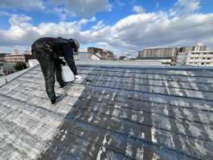 外壁・戸袋の吹き付け施工:上塗り仕上げ・エスケープレミアムルーフSiブラック色の施工です。