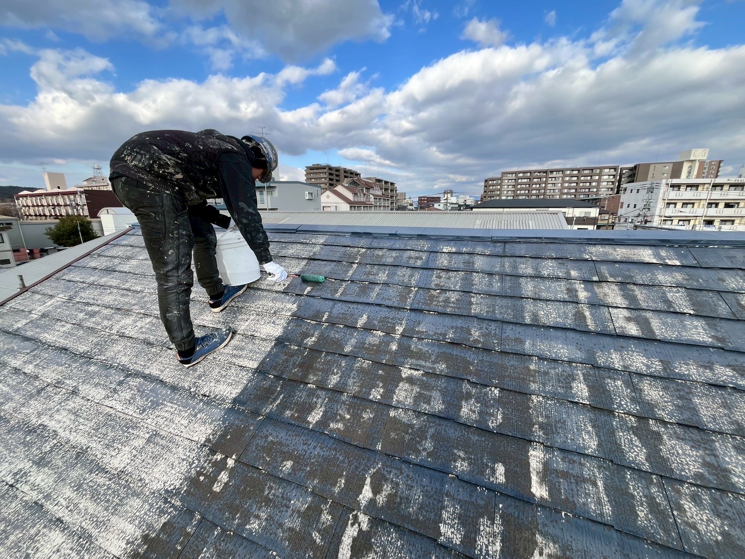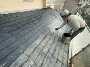 屋根・2Fコロニアル瓦・マイルドシーラーエポ、専用シーラー(接着剤)の塗布です。