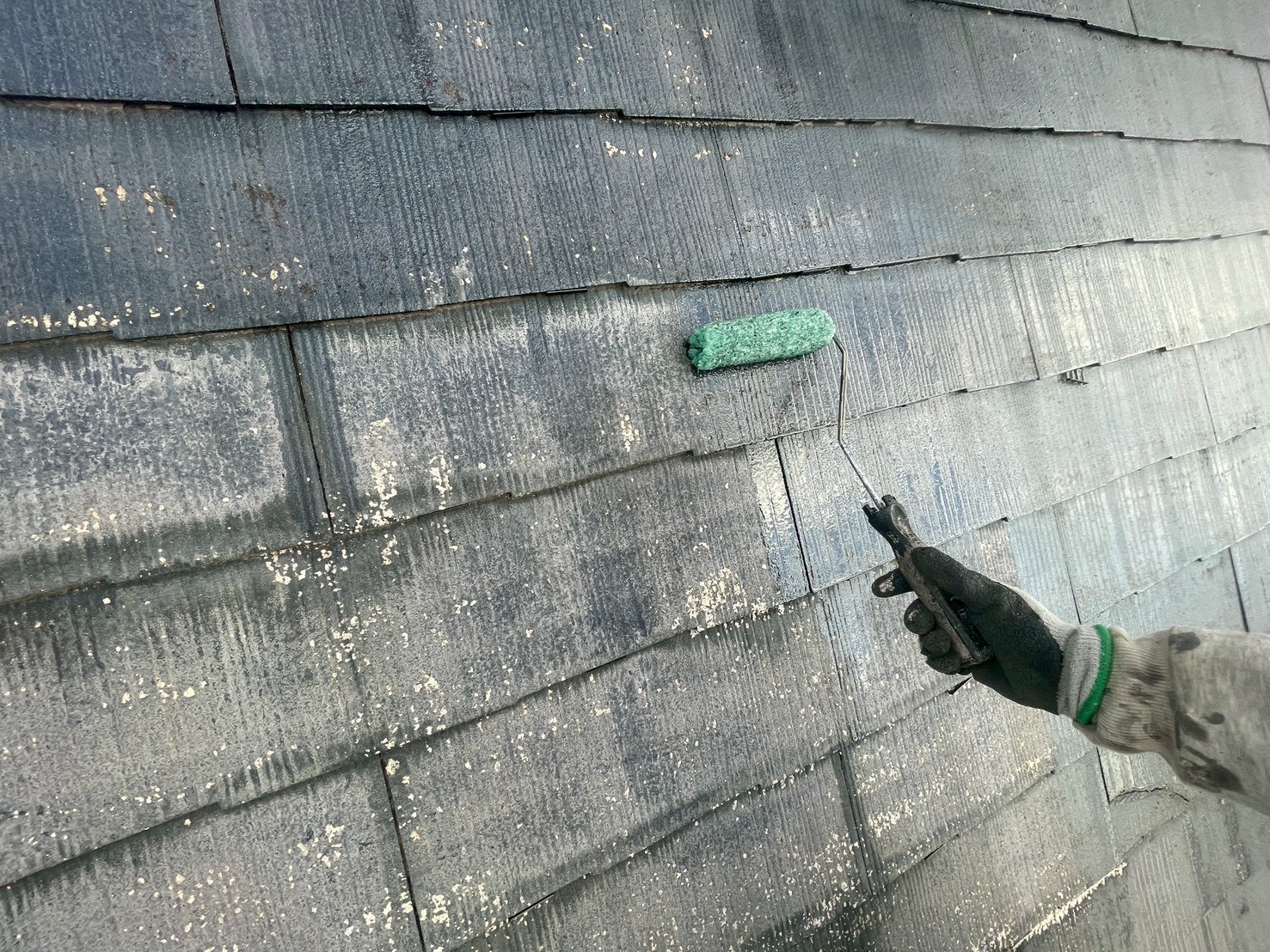 屋根・1Fコロニアル瓦ローラー塗り施工:上塗り仕上げ・エスケープレミアムルーフSi・SR-120色の施工です。