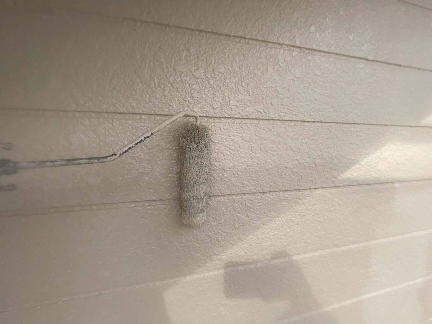 外壁・2Fベランダ内壁・上塗り仕上げ:エスケープレミアムシリコンラジカル塗料(SR-411色)のローラー塗り施工です。