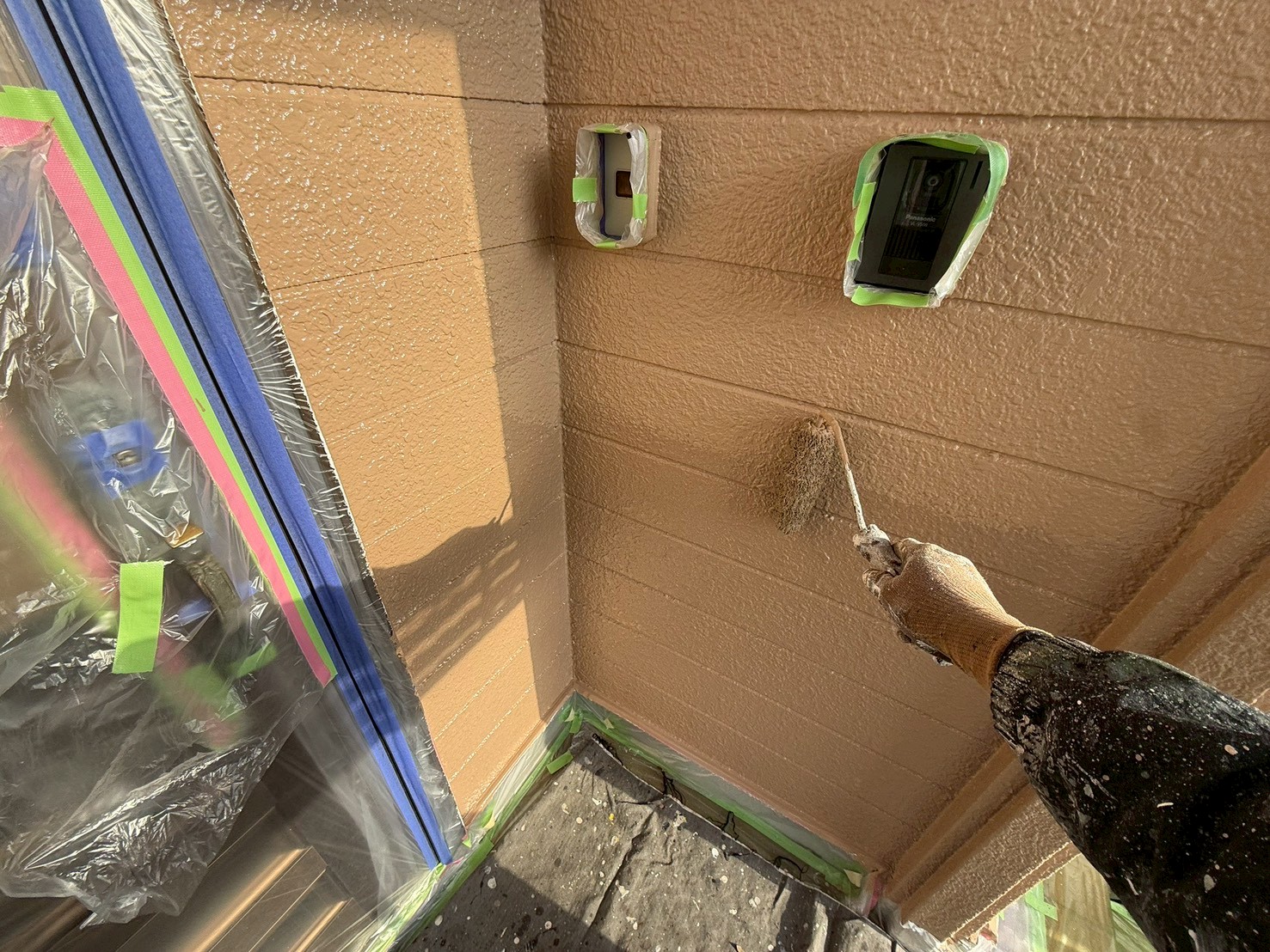 外壁・1F玄関廻り・上塗り仕上げ:エスケープレミアムシリコンラジカル塗料(SR-411色)のローラー塗り施工です。