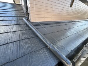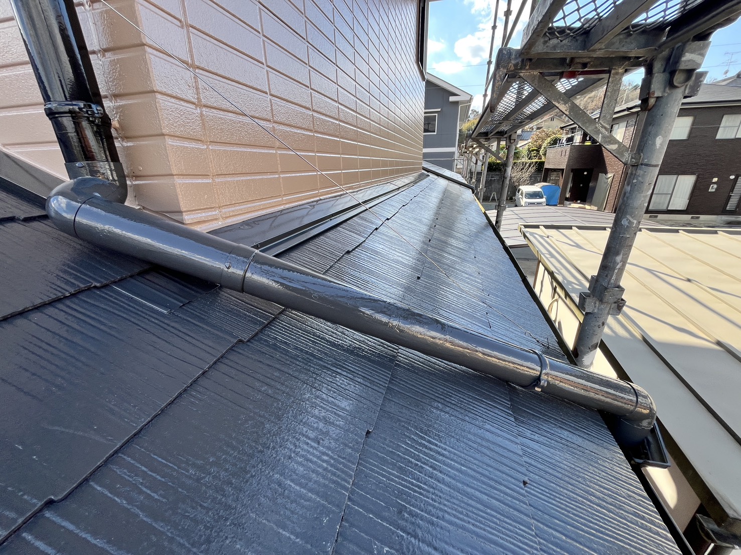 屋根・1F雨樋、ローラー塗り施工:上塗り仕上げ・エスケープレミアムルーフSi・SR-120色の施工です。