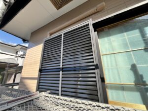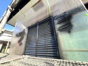 外壁・戸袋の吹き付け施工・上塗り仕上げ・エスケープレミアムルーフSiブラック色の施工:艶が出てきれいに仕上がりました。