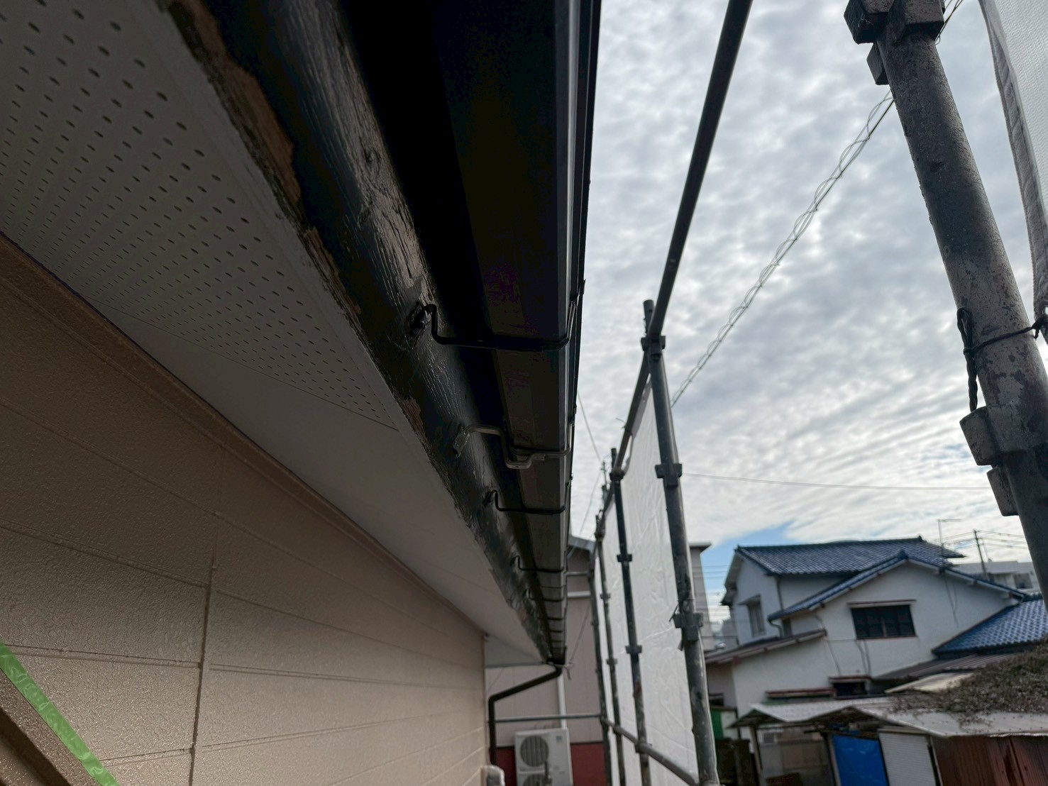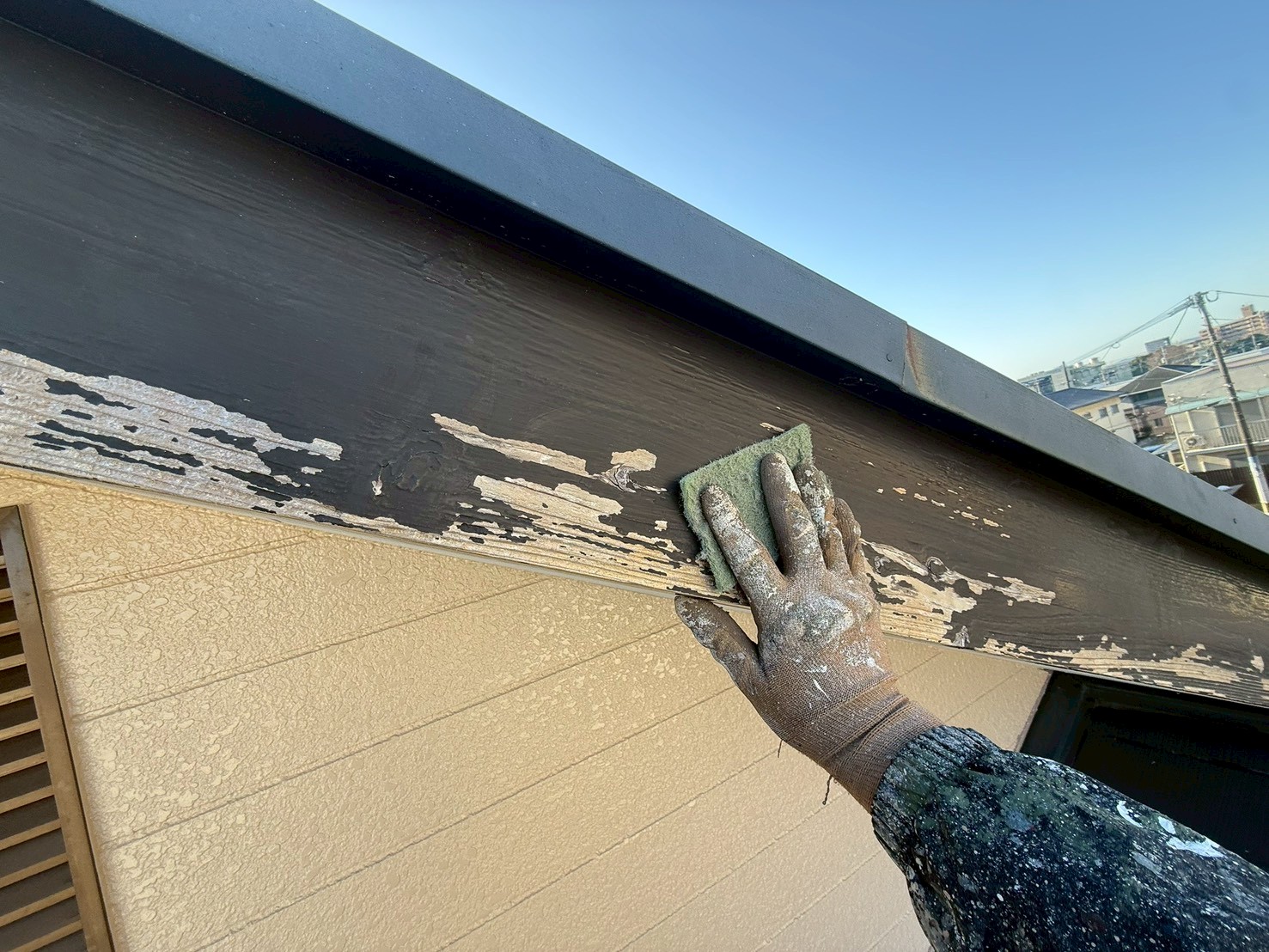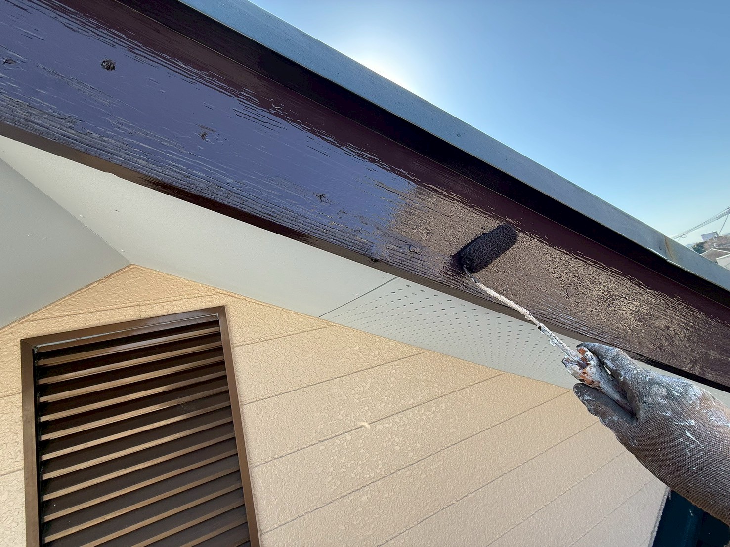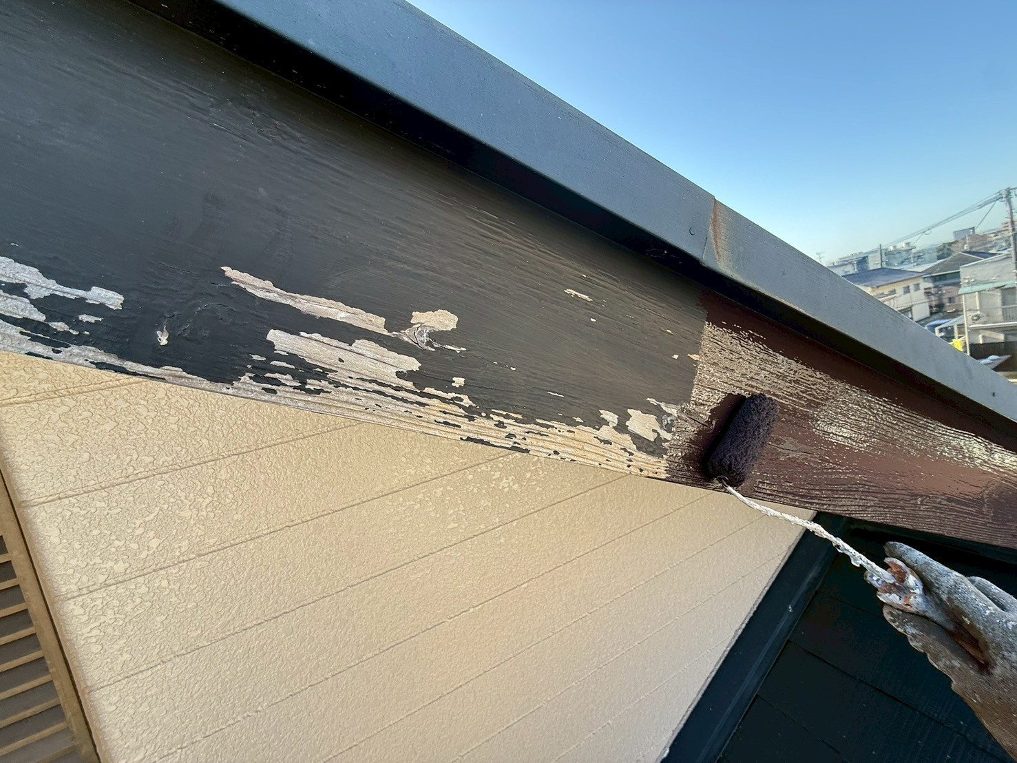 外壁・破風板(幕板)・ケレン処理施工後、下塗り(ラジカル塗料)施工です。