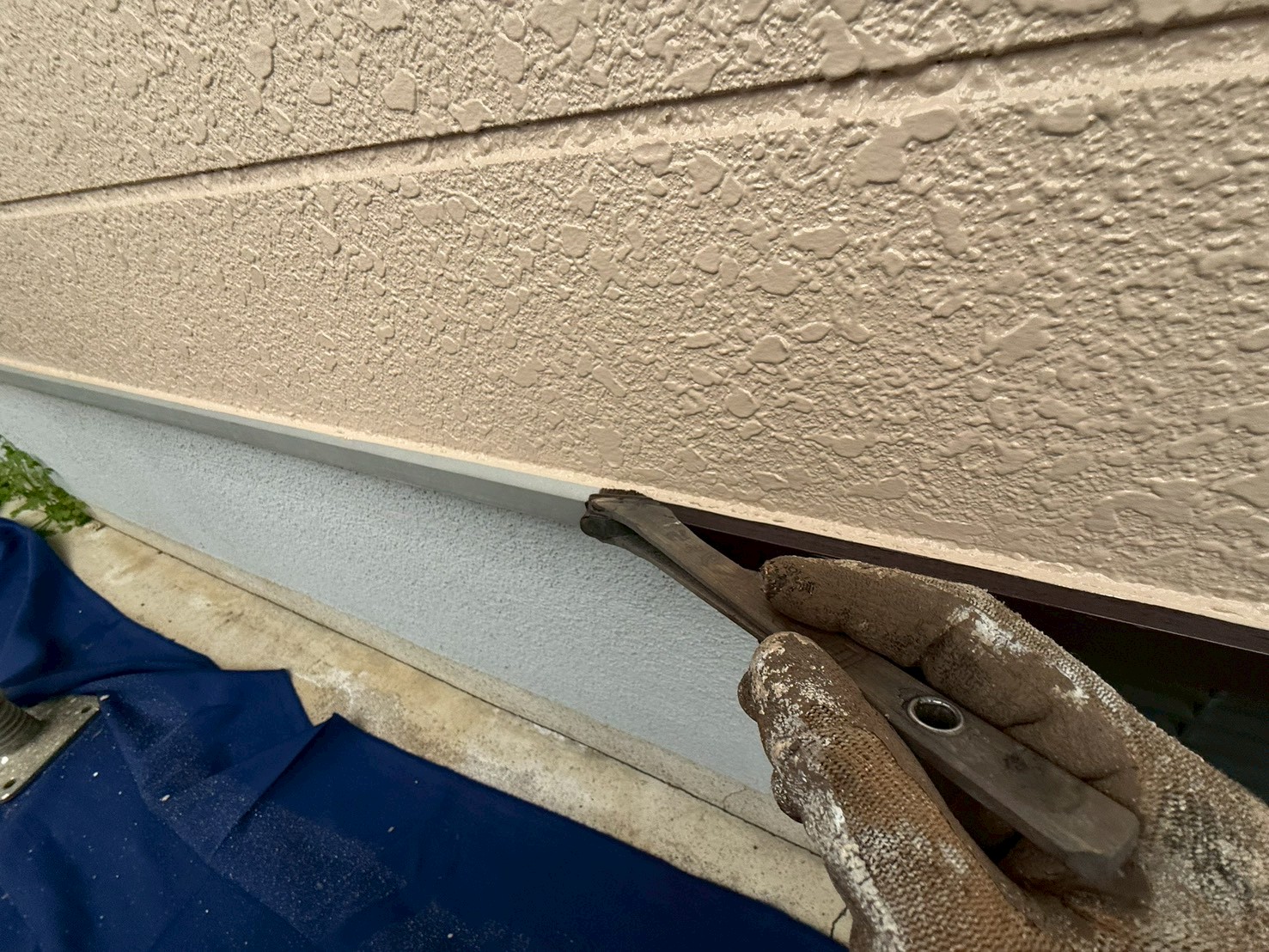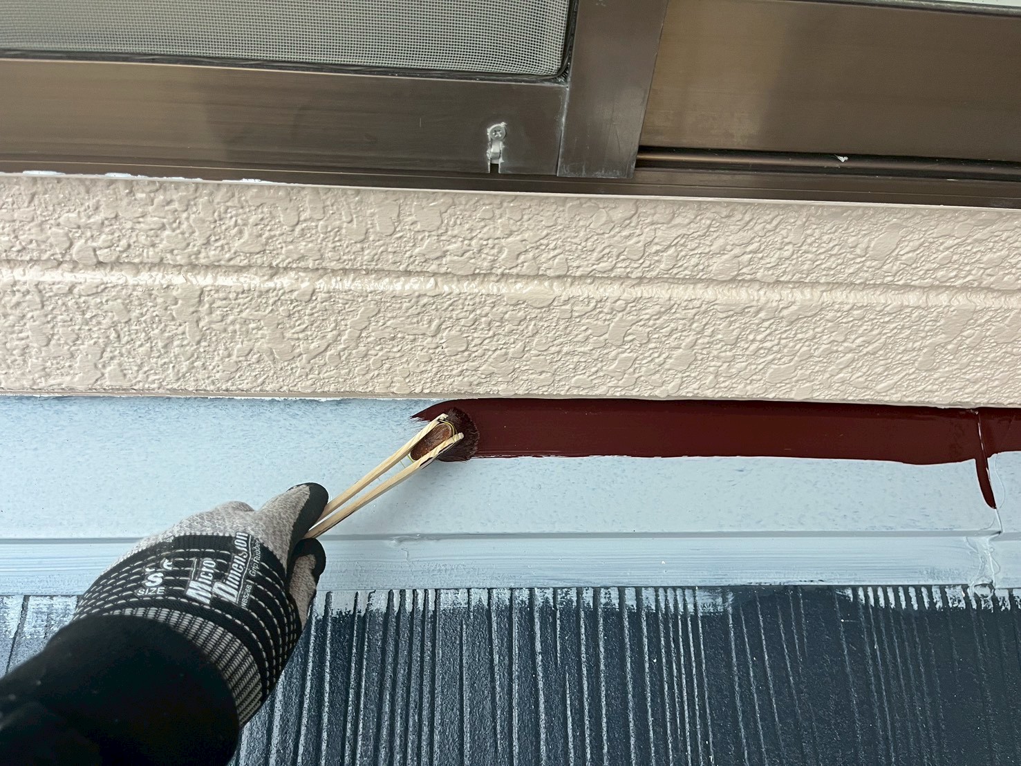 外壁・雨切り部・細かい部分のケレン処理後、下塗り(ラジカル塗料)施工です。