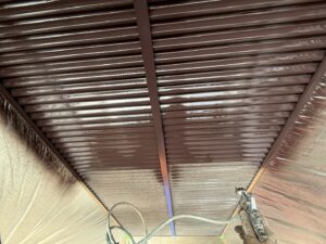 外壁・戸袋部・上塗り仕上げ、エスケープレミアムルーフSi・コーヒーブラウン色の吹き付け施工です。