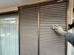 外壁・戸袋部・エスケープレミアムルーフSi・コーヒーブラウン色の施工:基本作業のケレン処理です。