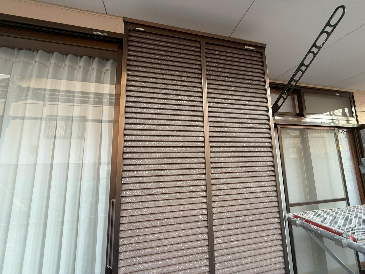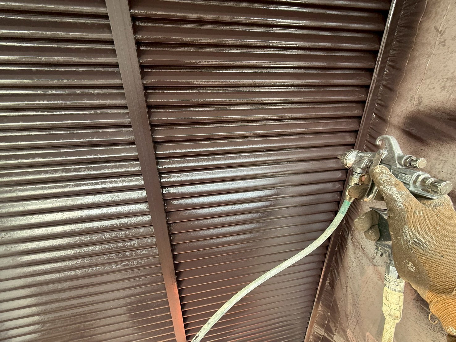 外壁・戸袋部・上塗り仕上げ、エスケープレミアムルーフSi・コーヒーブラウン色の吹き付け施工です。