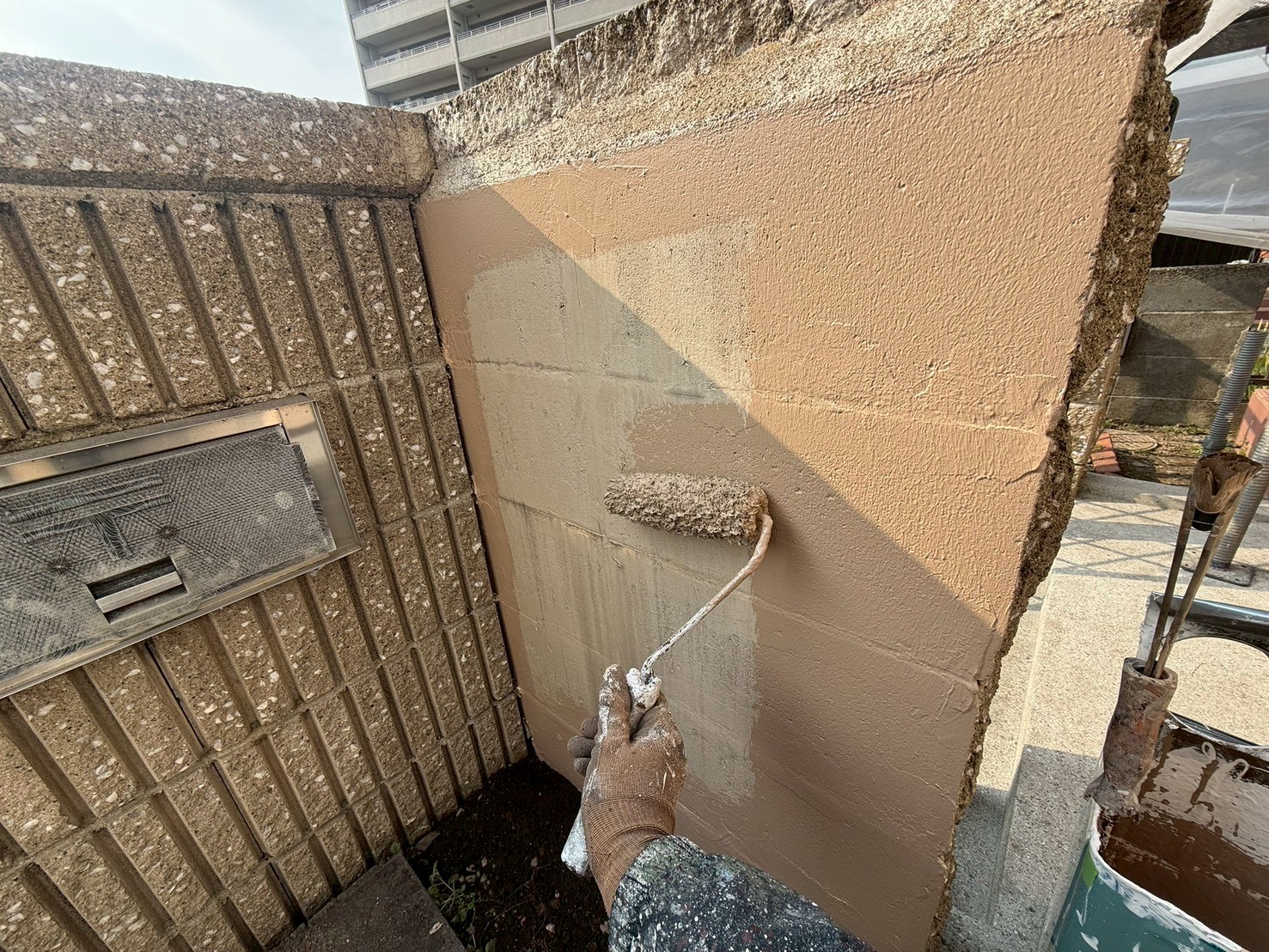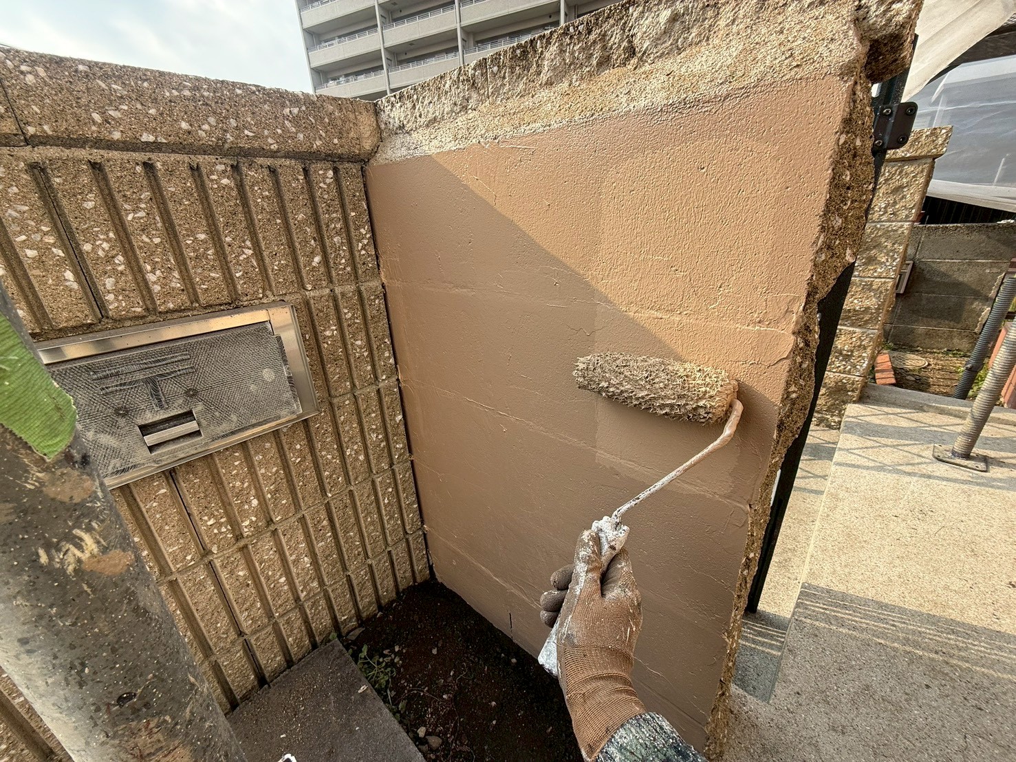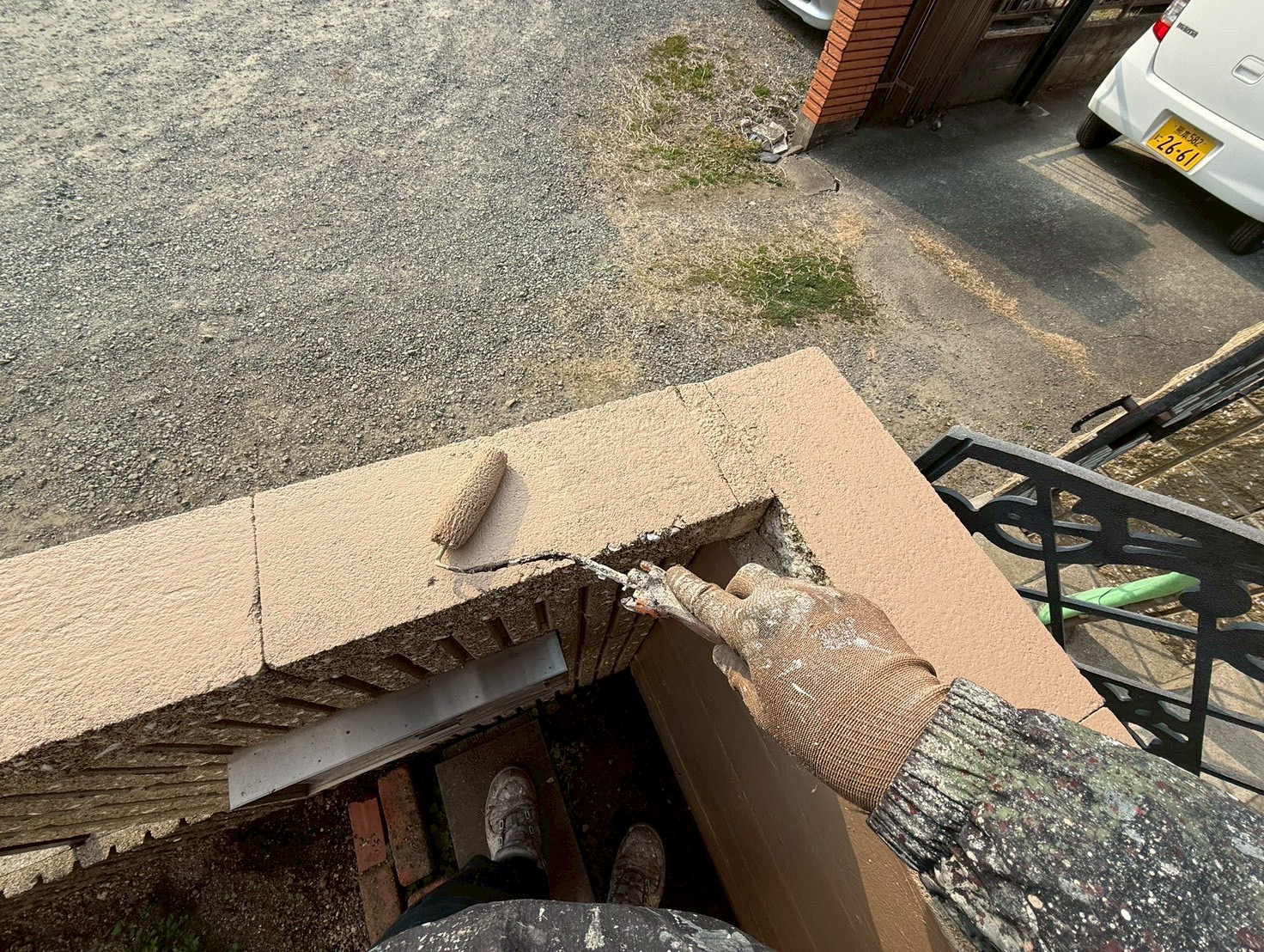 外部・門柱(両面)笠木天端の、上塗り仕上げ・ラジカル塗料のローラー塗り施工です。