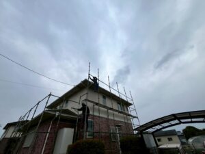 外壁・屋根:南東面側・架設足場組み上げと飛散防止ネット取り付けの施工後です。