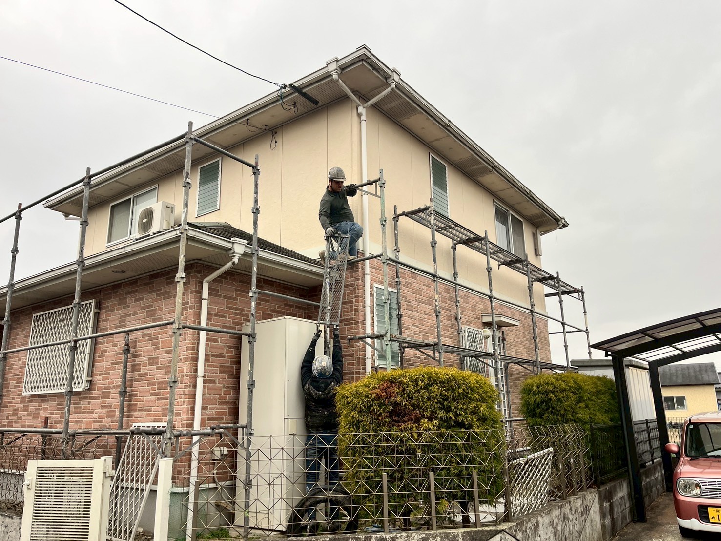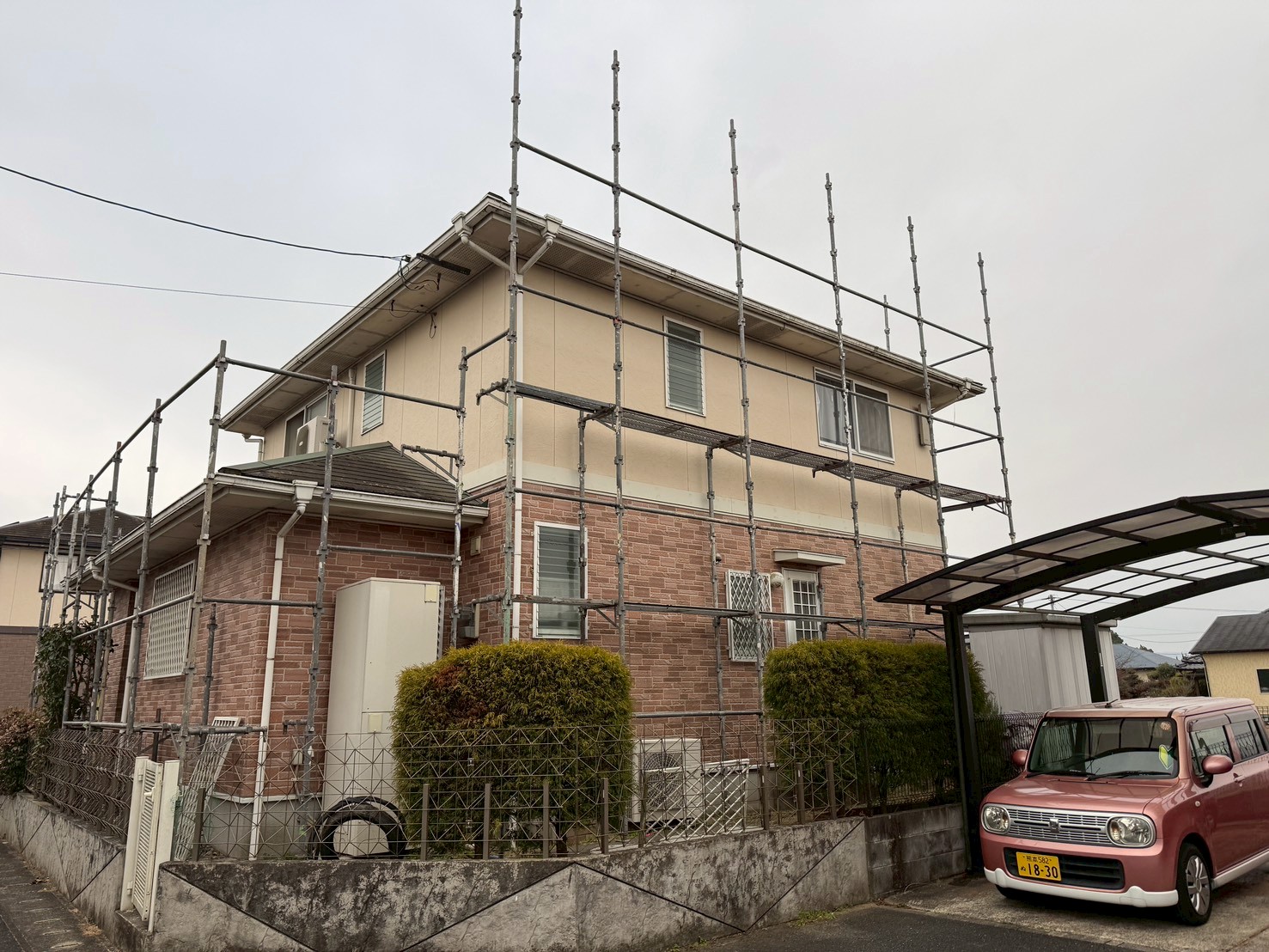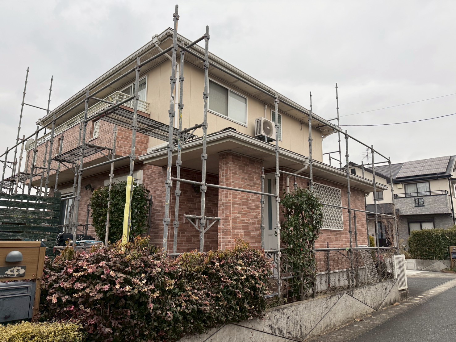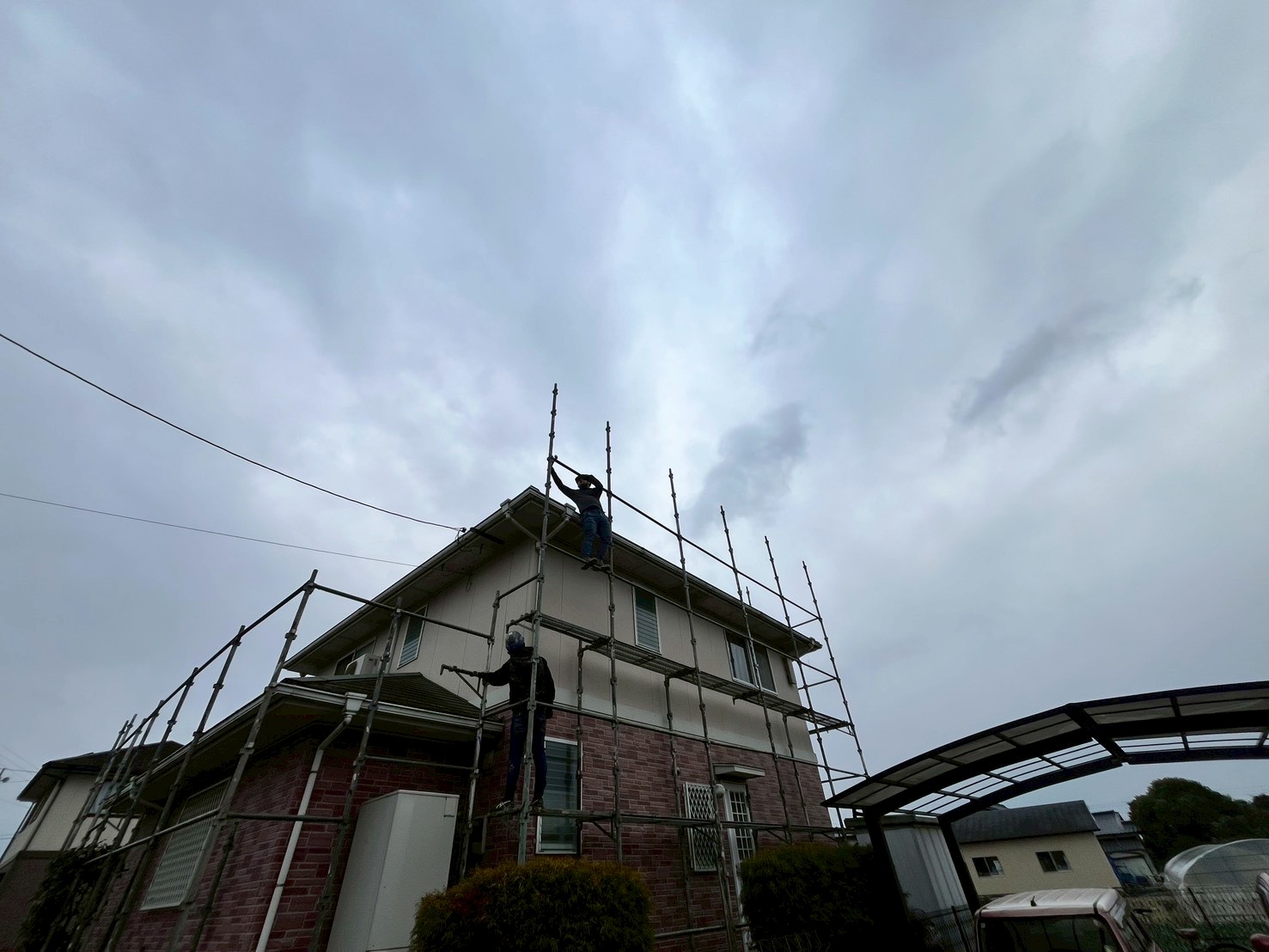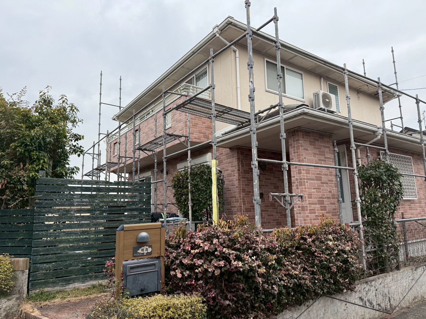 外壁・屋根:南西面側・架設足場組み上げと飛散防止ネット取り付けの施工前です。