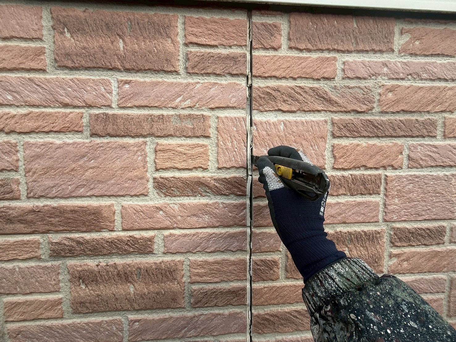 外壁・2Fベランダ外側面・旧コーキング材撤去作業:両サイドを、カッターで切り込み剥ぎ取ります。