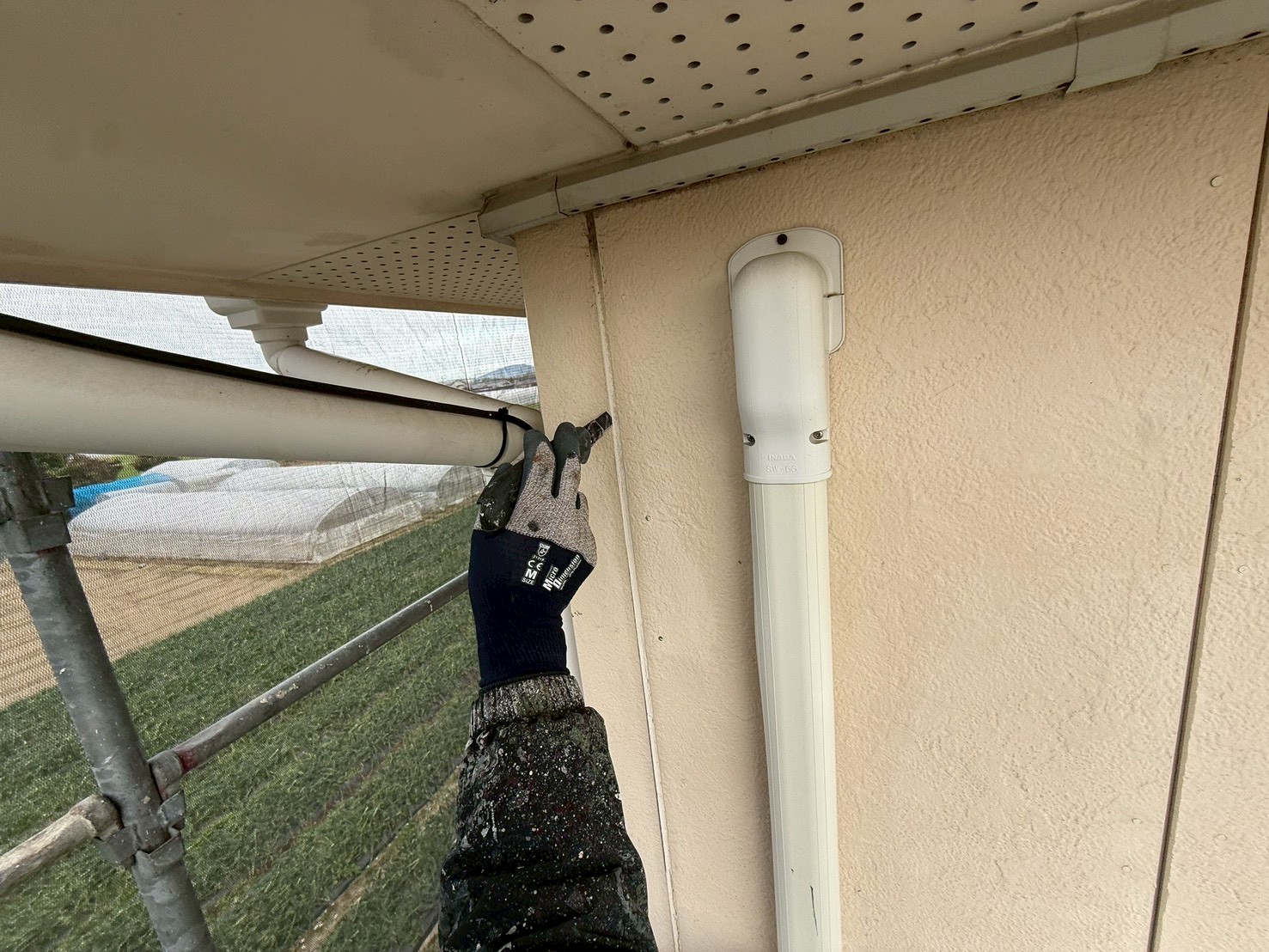 本日の作業は、外壁・テープ養生・下地処理(ビス止め・パテ処理)の施工です。