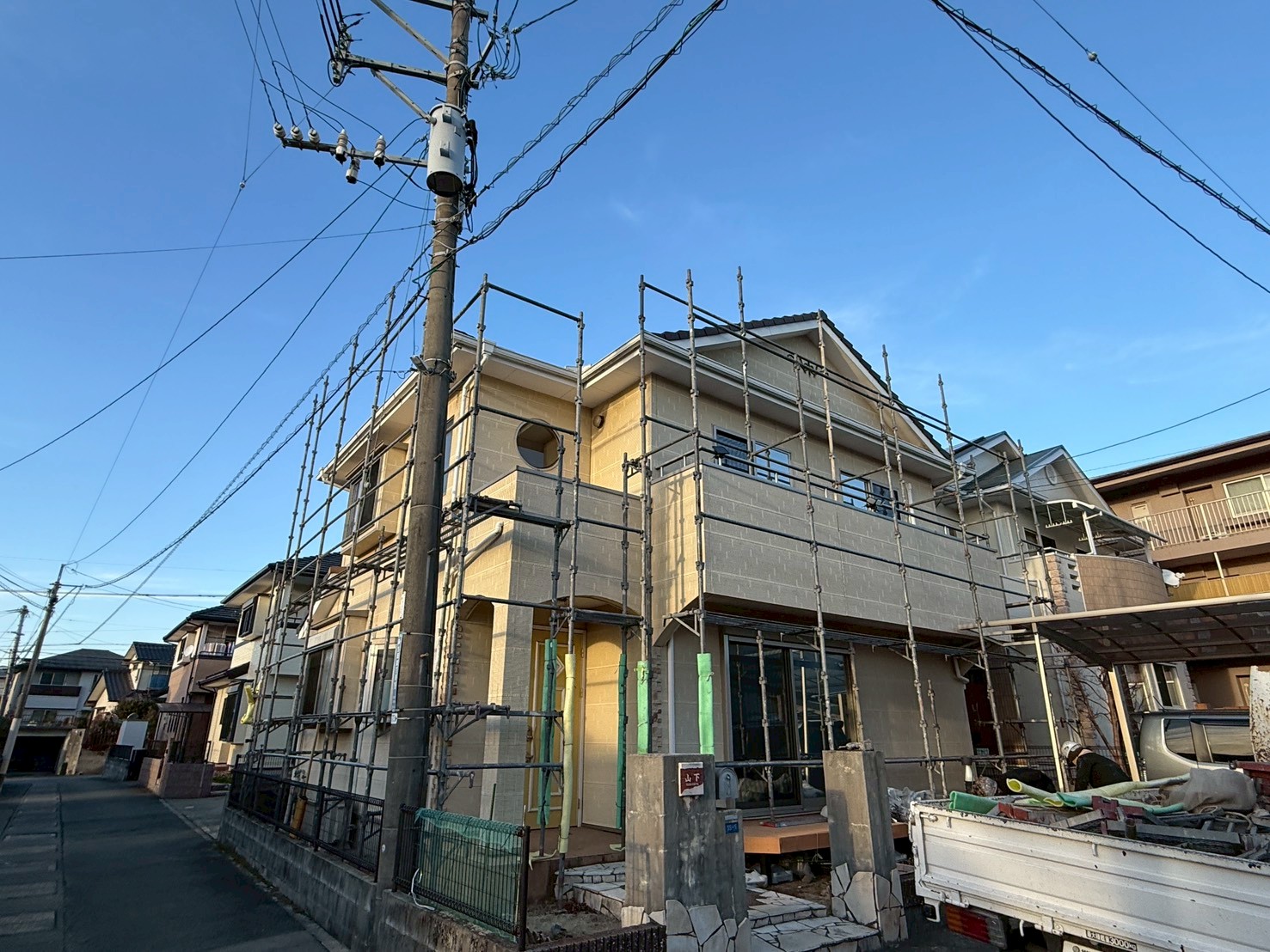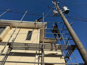 外壁・東面側、架設足場組み上げの施工です。