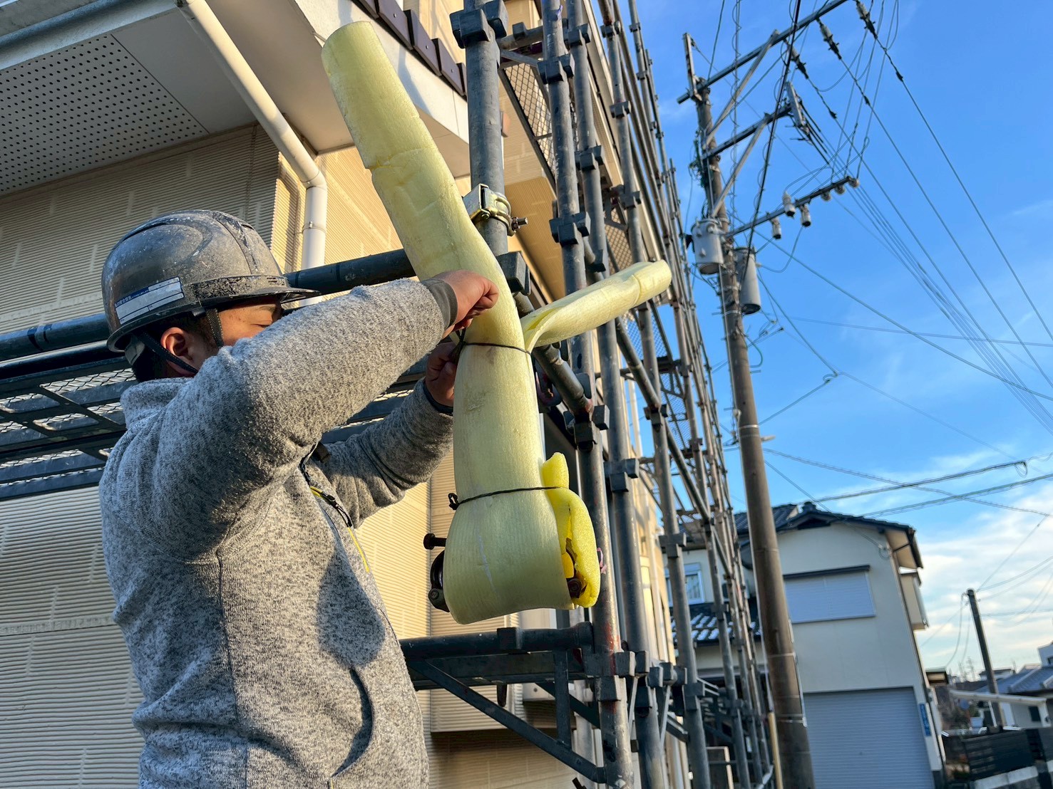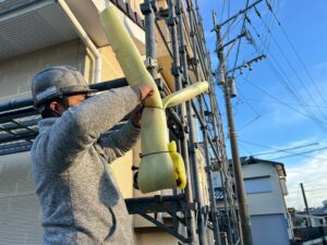 外壁・架設足場組み上げの施工:怪我をされないように、保護カバーの取り付けを行います。