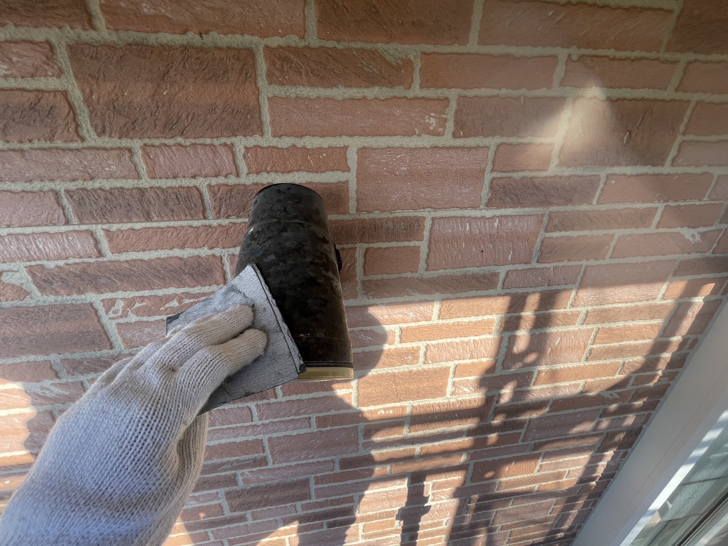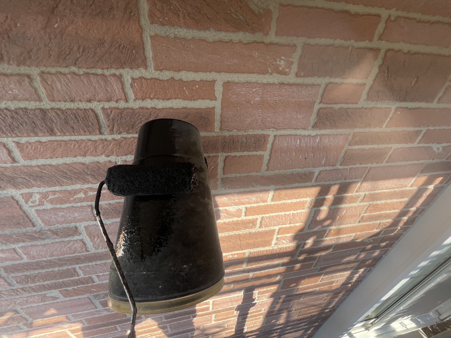 外壁・玄関明り取り・スポットライト・ポスト等、ケレン処理後、エスケープレミアム無機ブラックのローラー塗り施工です。
