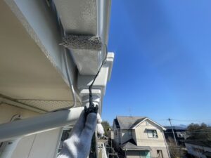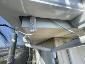 外壁・2F雨樋(軒樋):中塗り、エスケープレミアム無機マイルド(N-85)のローラー塗り施工です。