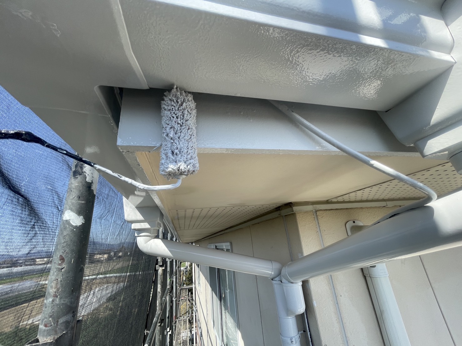 外壁・2F破風板(幕板):中塗り、エスケープレミアム無機マイルド(N-85)のローラー塗り施工です。