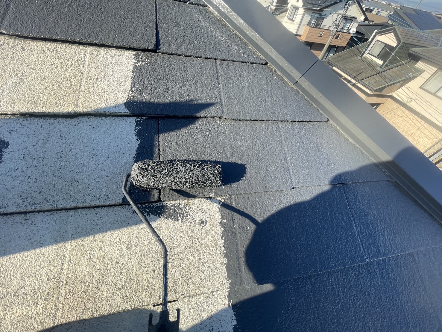 屋根・2F中塗り:エスケープレミアム無機ルーフRC-120色ローラー塗り施工です。