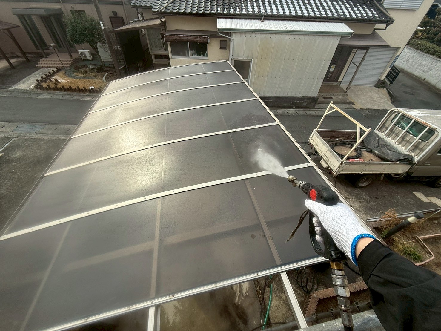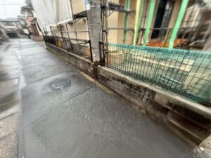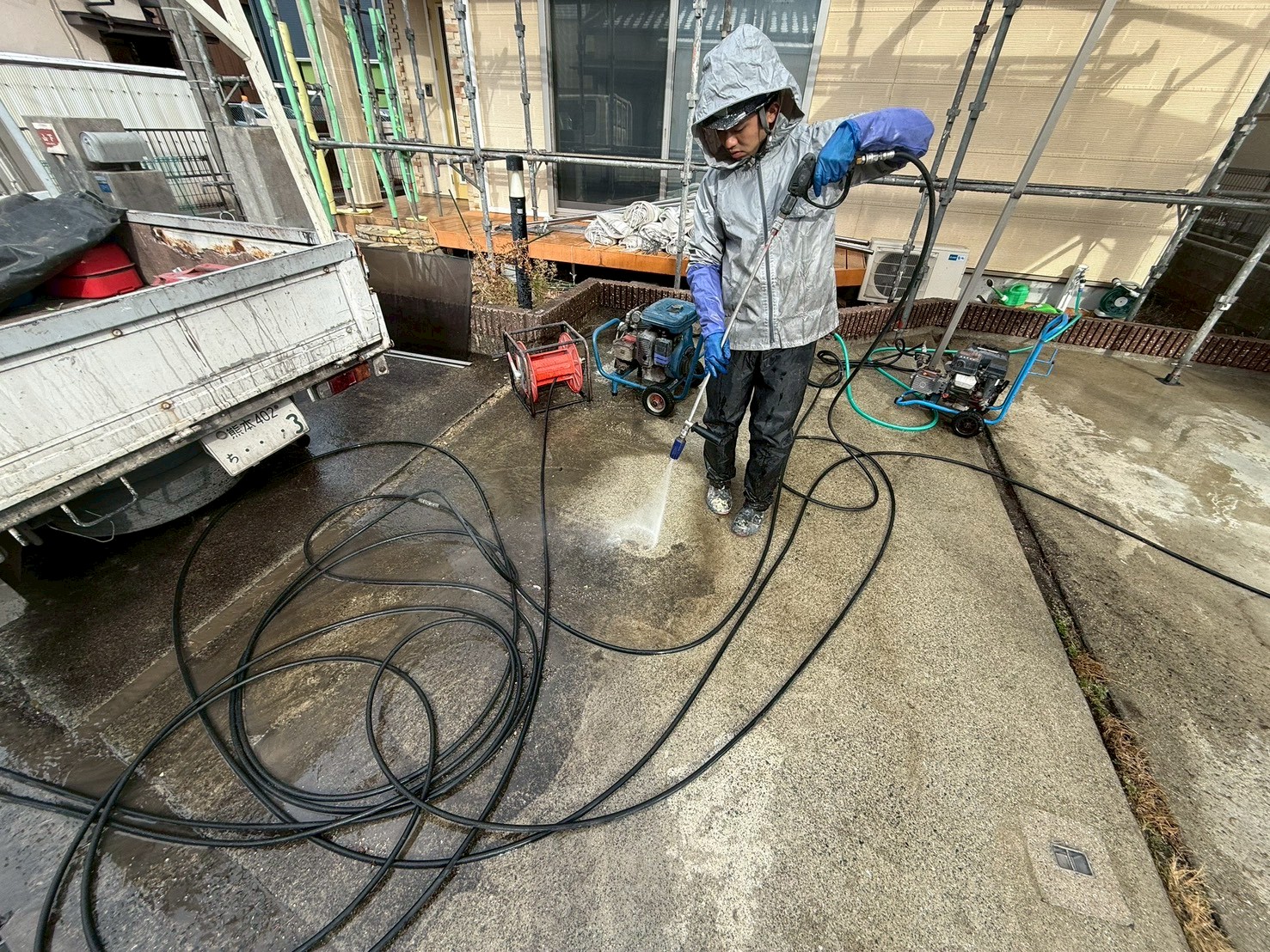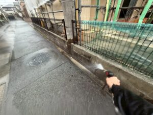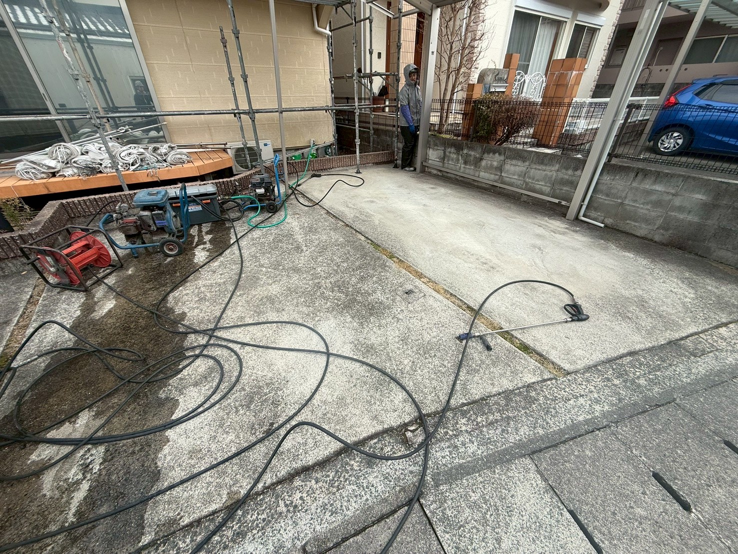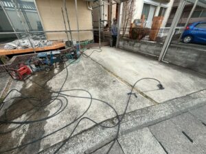 外部・駐車場車庫・高圧洗浄施工中です。