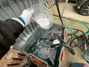 外壁・バイオ高圧洗浄施工前に、タンクにバイオ剤投入です。