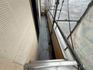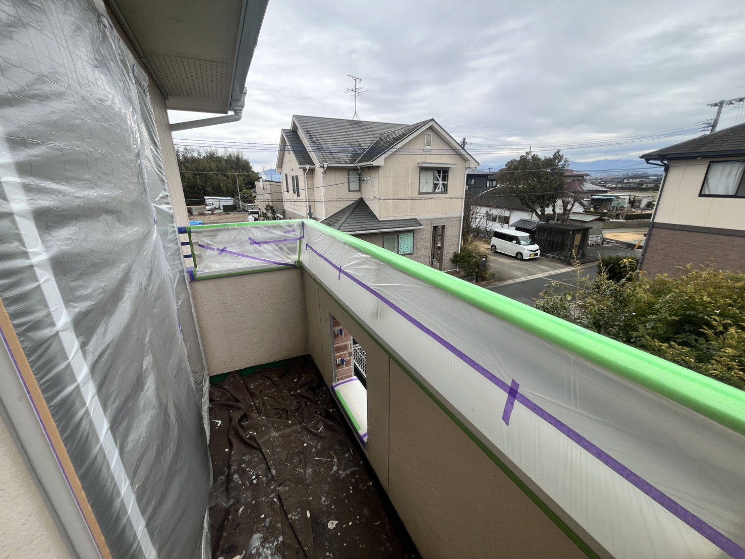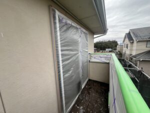 外壁・下塗り施工前に、養生の点検確認(ベランダ・窓廻り・屋根)の施工を行いました。