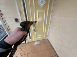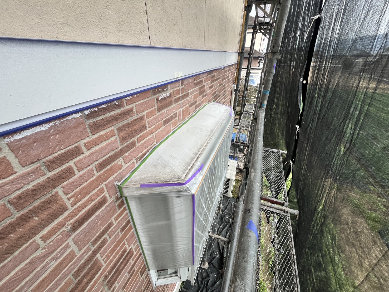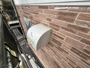 外壁・下塗り施工前に、養生の点検確認(換気扇・フード・出窓・帯・インターホン)の施工を行いました。