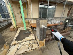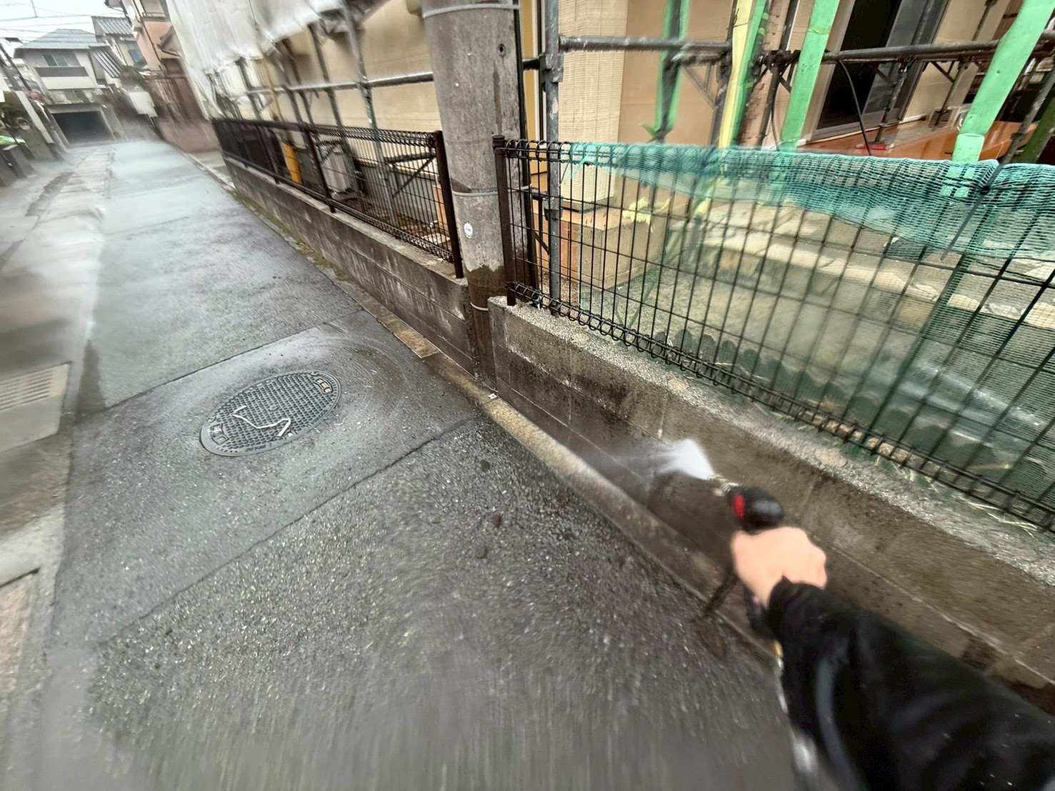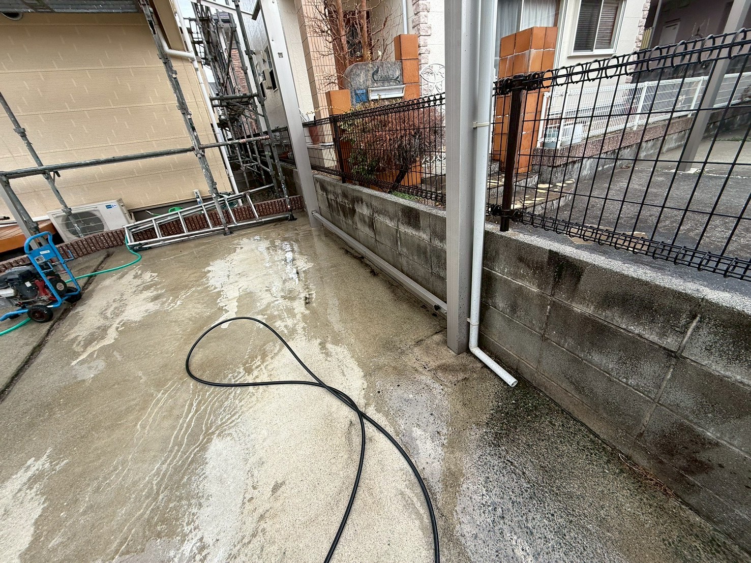 外部・駐車場車庫(ブロック塀)・高圧洗浄施工中です。