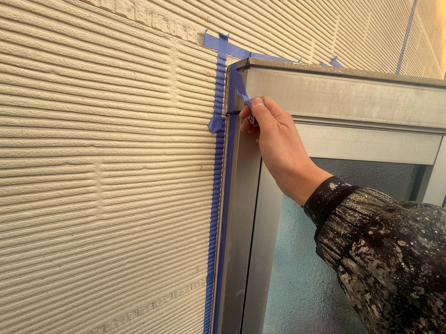 外壁・窓廻りの旧コーキング材撤去:専用テープを貼ります。