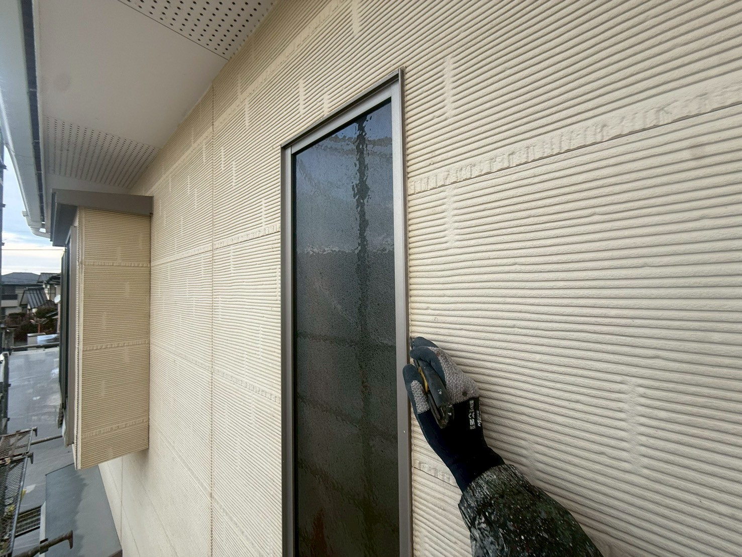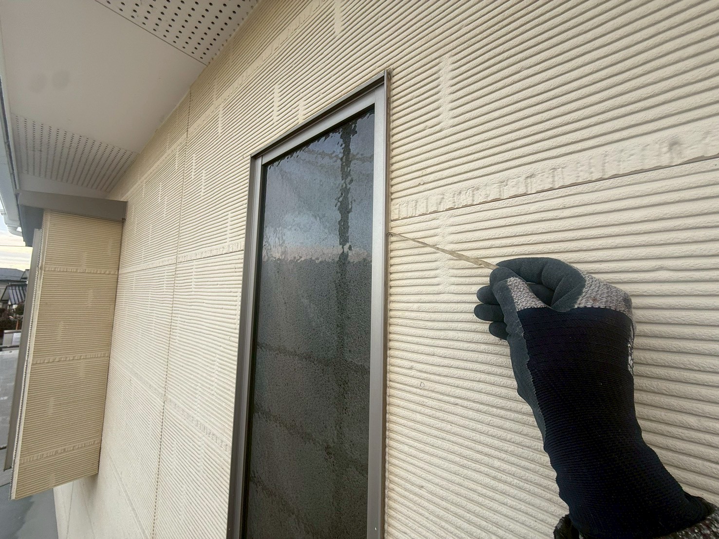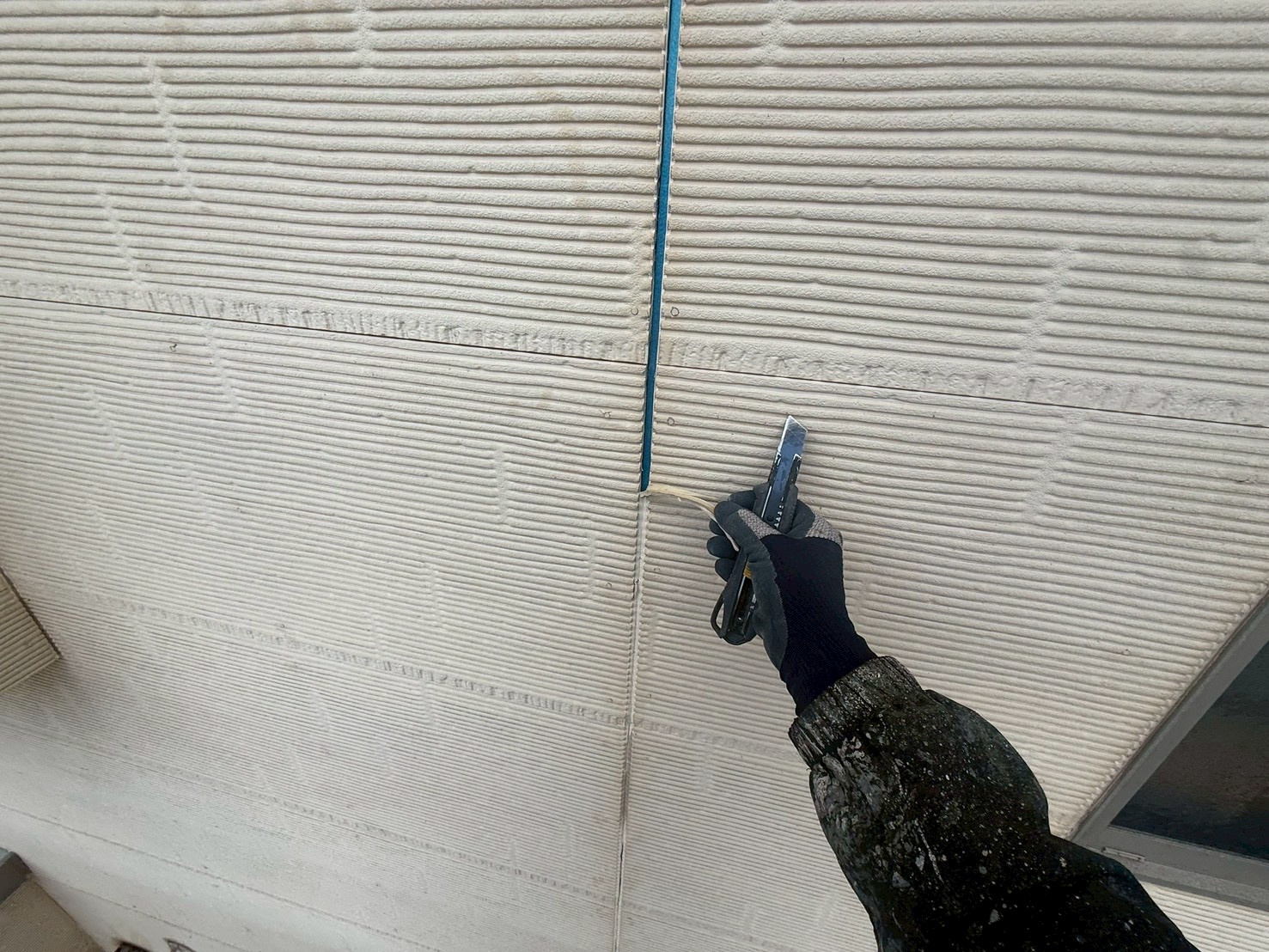 外壁・窓廻りの旧コーキング材撤去:傷を付けないように両サイドを、カッターで切り込みます