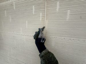 外壁・目地部の旧コーキング材撤去:両サイドを、カッターで切り込みます