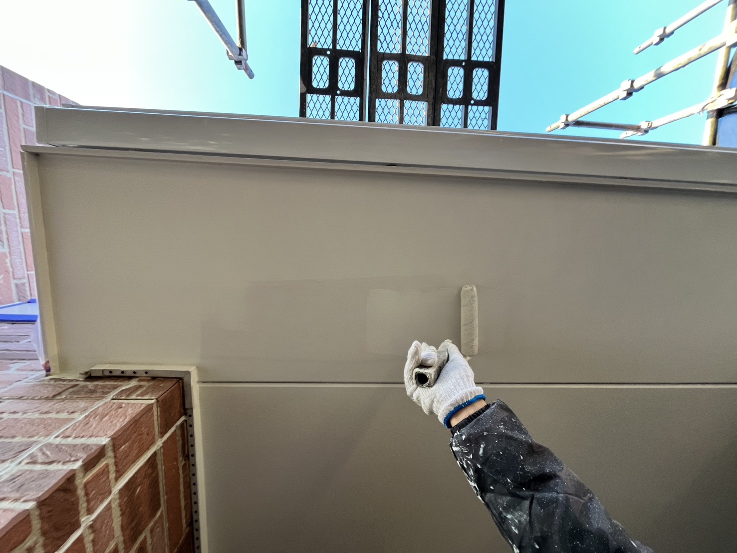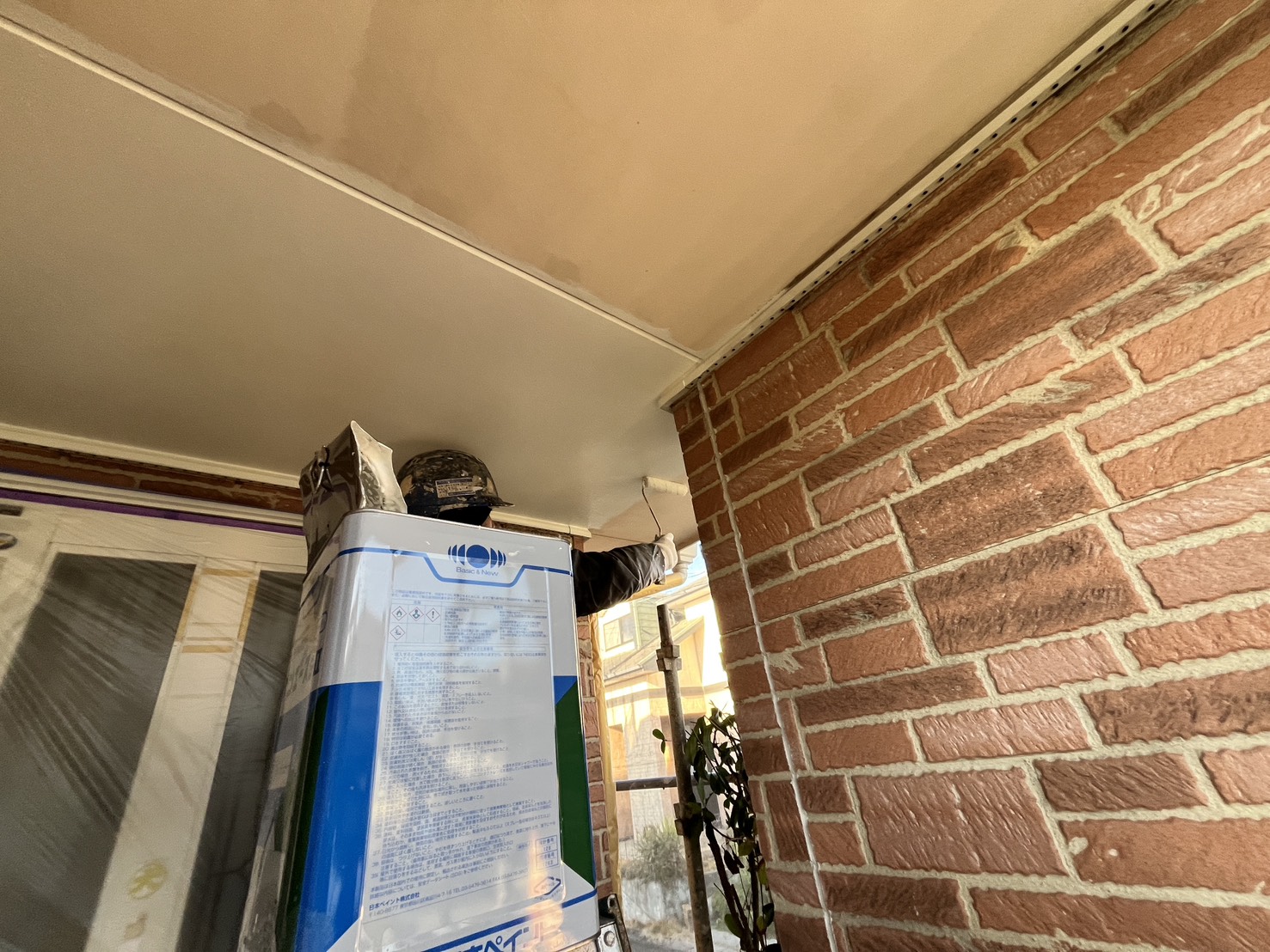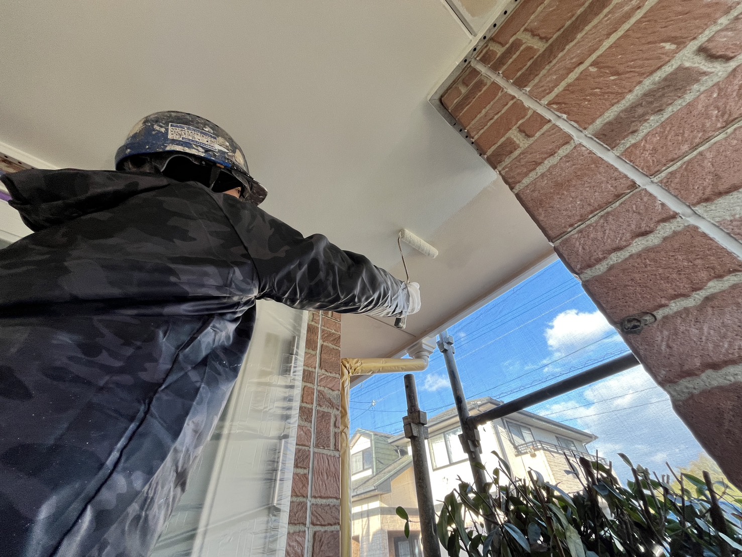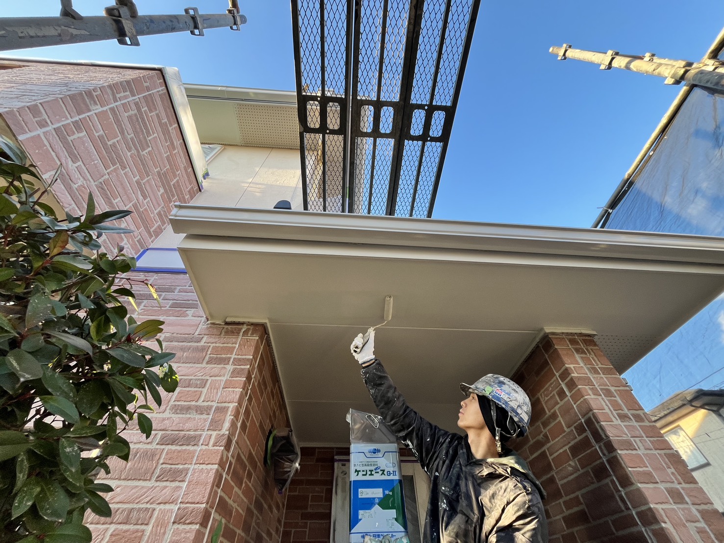 外壁・軒天部・上塗り仕上げ:ケンエースG-Ⅱ(防カビ剤入り)のローラー塗り施工です。