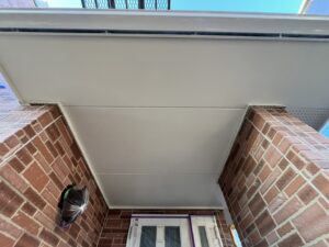 外壁・軒天部・上塗り仕上げ:ケンエースG-Ⅱ(防カビ剤入り)のローラー塗り施工:きれいに仕上がりました。