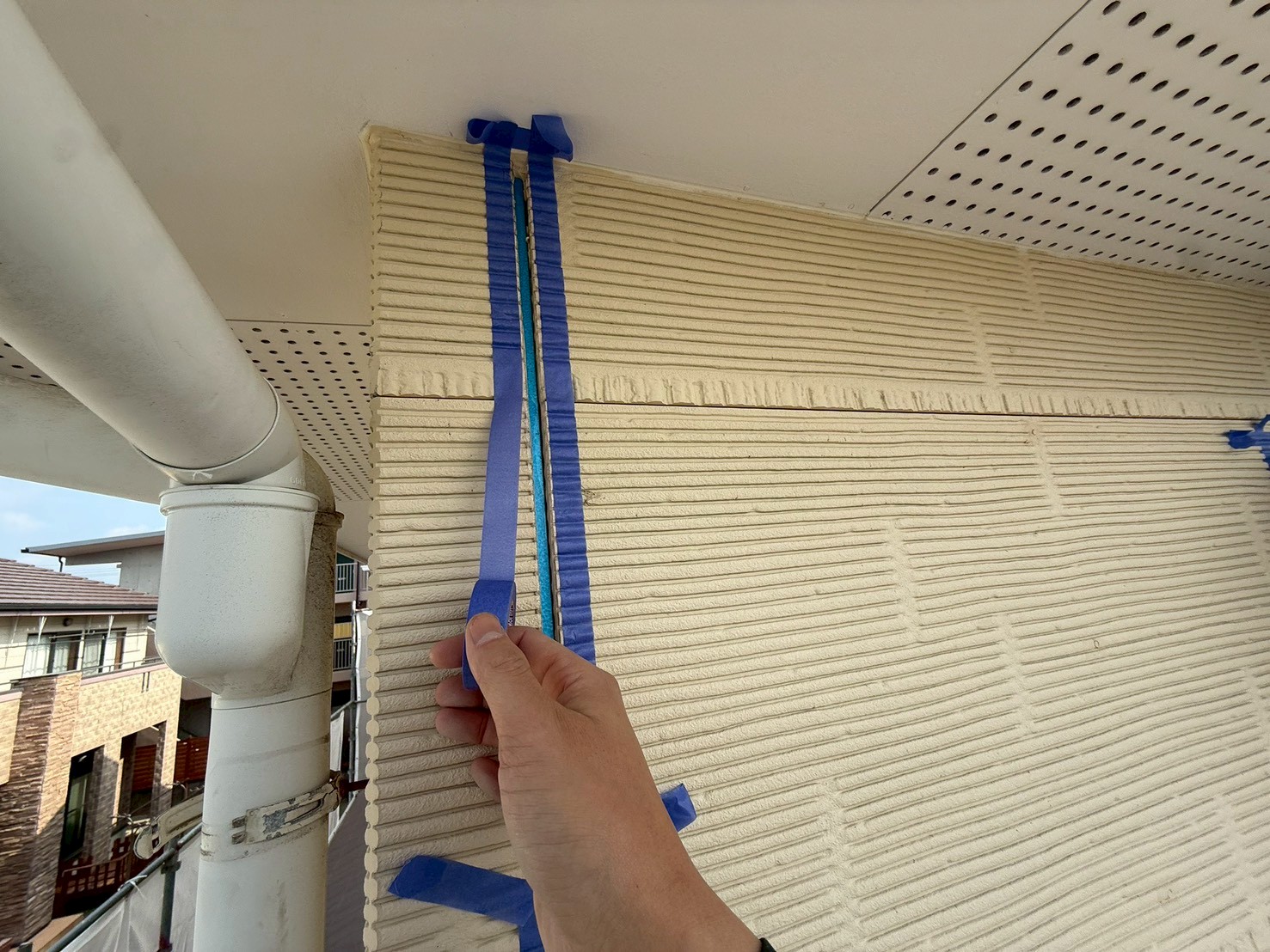 外壁・壁面目地部・専用コーキングテープ養生貼りの施工です。 ※(廻りを汚さないように)