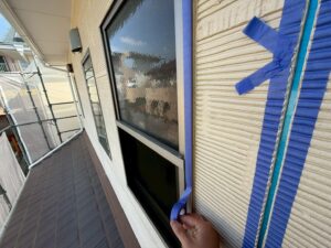 外壁・窓廻り目地部・専用コーキングテープ養生貼りの施工です。