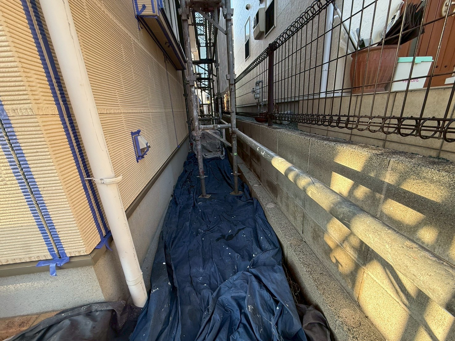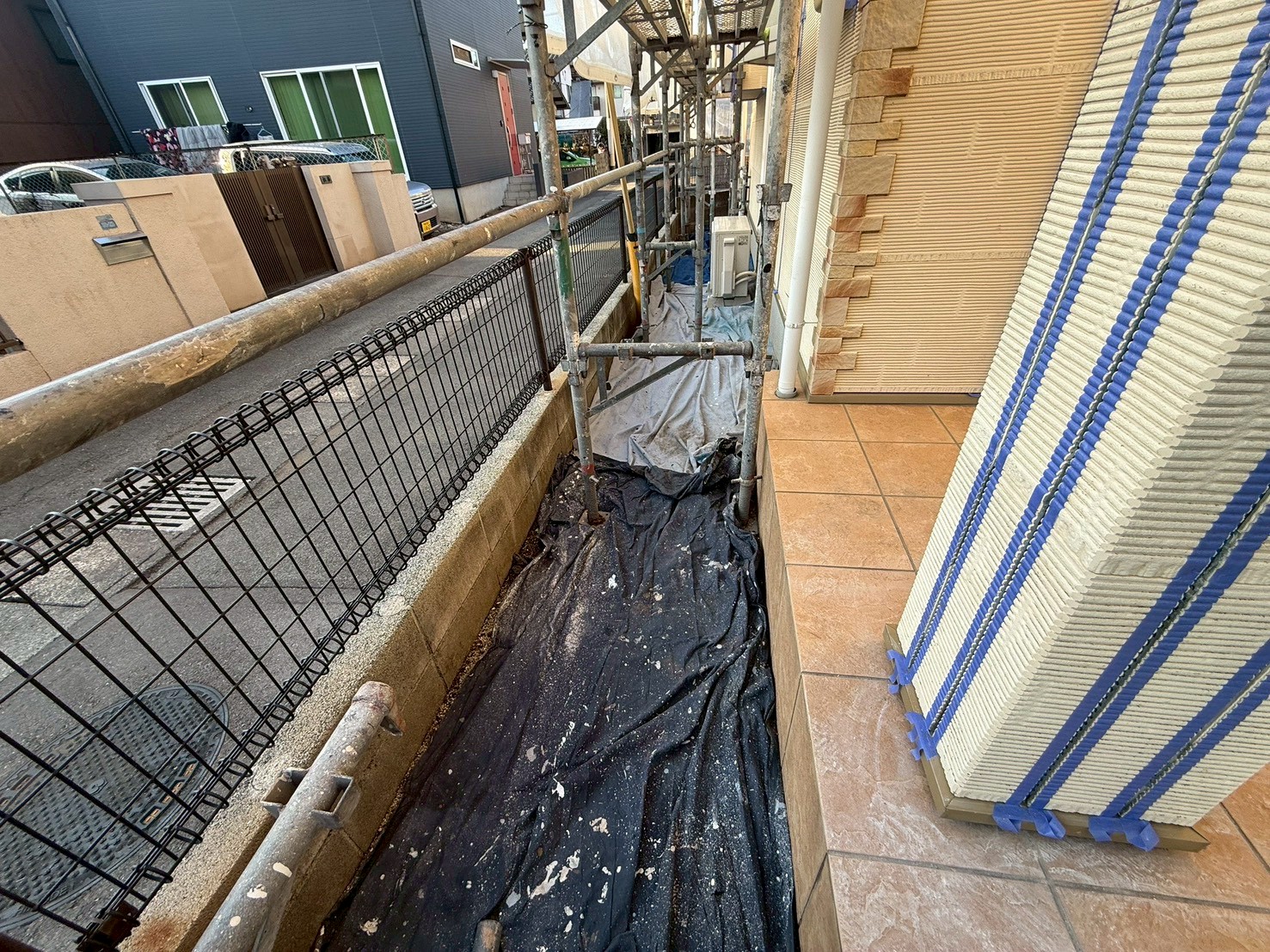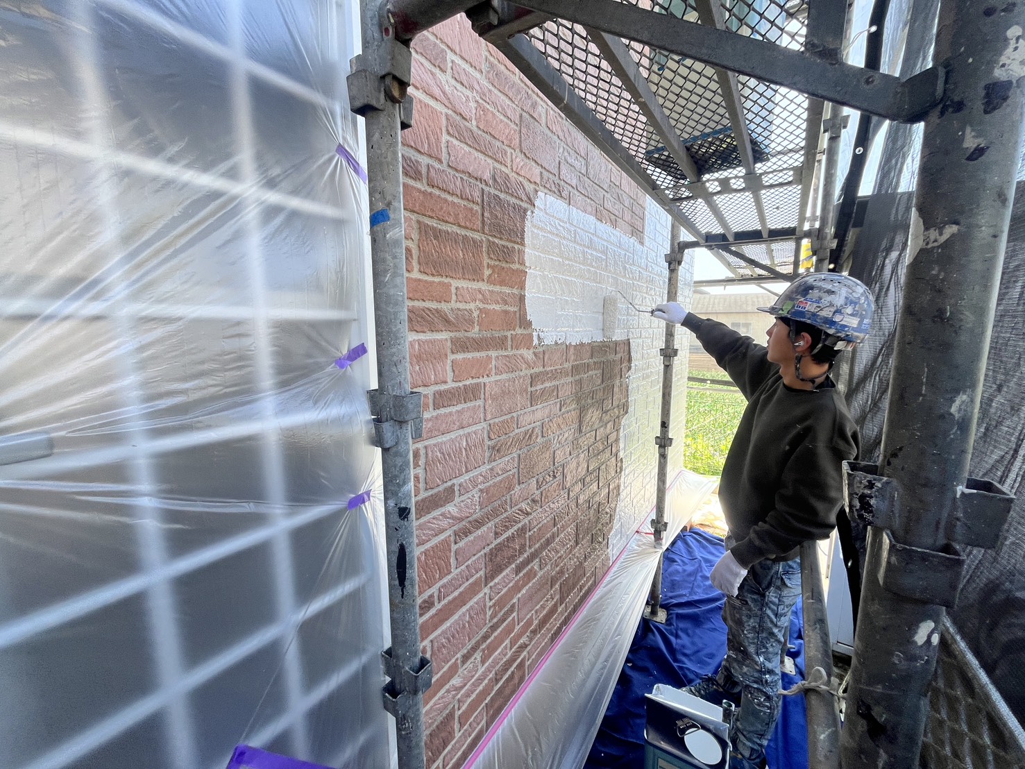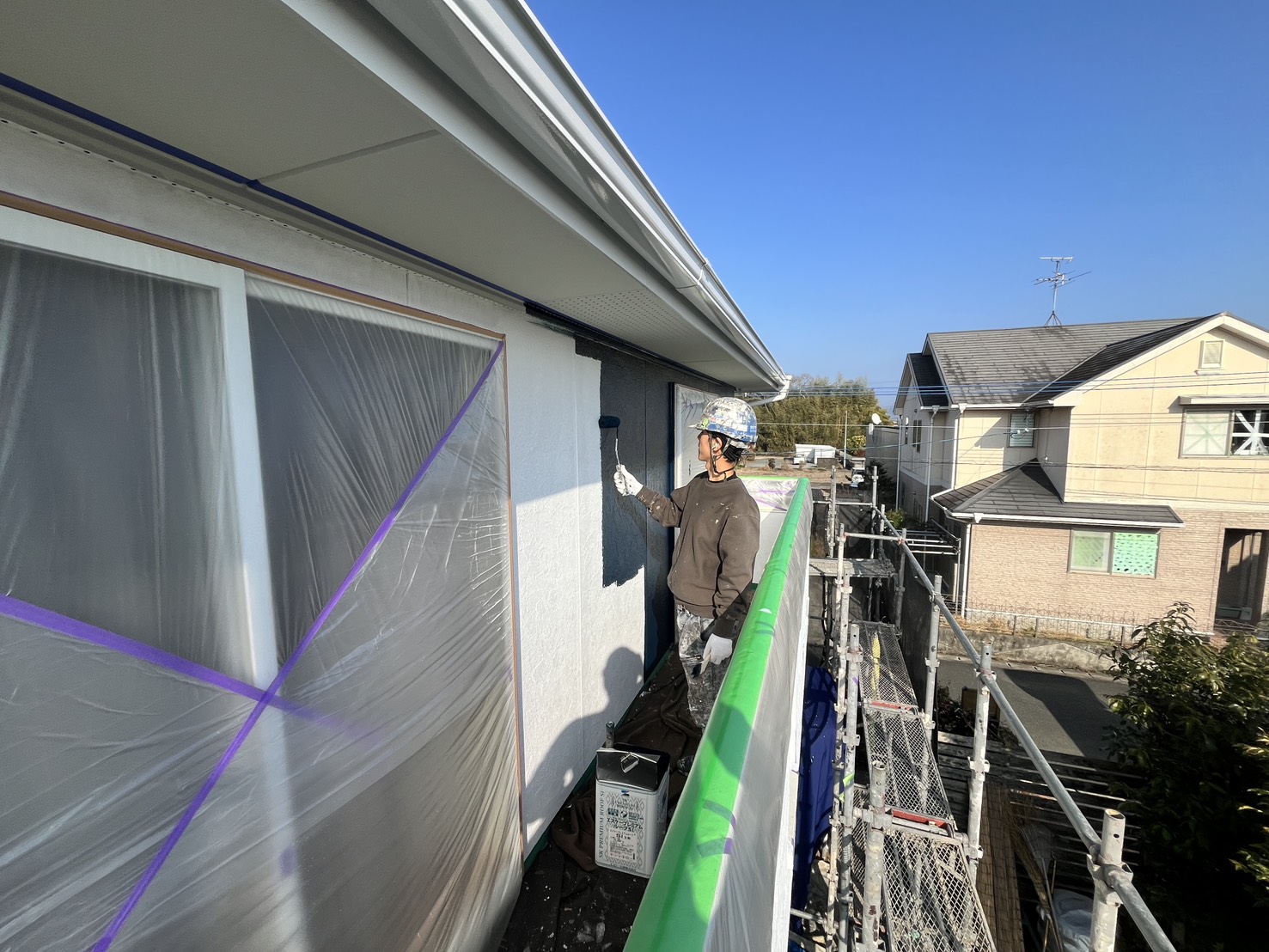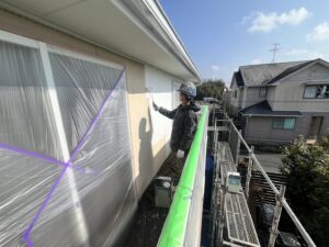 本日の作業は、外壁・養生:中塗り、上塗り、プレミアム無機の施工です。