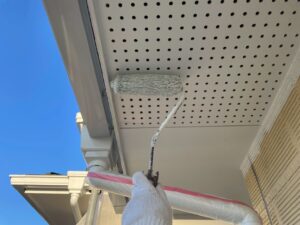 外壁・軒天・上塗り仕上げ:ケンエースG-Ⅱ(防カビ剤入り)の施工です。