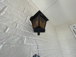 外壁・玄関廻り(ドア、開閉が出来るように貼り上げます)の養生施工です。