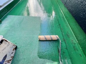 外壁・2Fベランダ床面・専用プライマー(接着剤)のローラー塗り施工:しっかり乾燥させます。