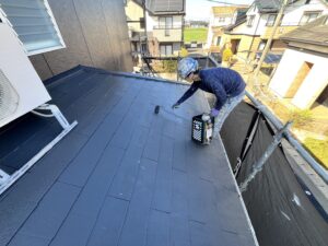 屋根・1F・上塗り仕上げ:エスケープレミアム無機ルーフ・SR-120のローラー塗り施工です。