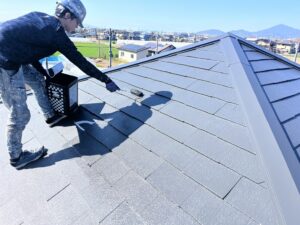 屋根・2F・上塗り仕上げ:エスケープレミアム無機ルーフ・SR-120のローラー塗り施工です。