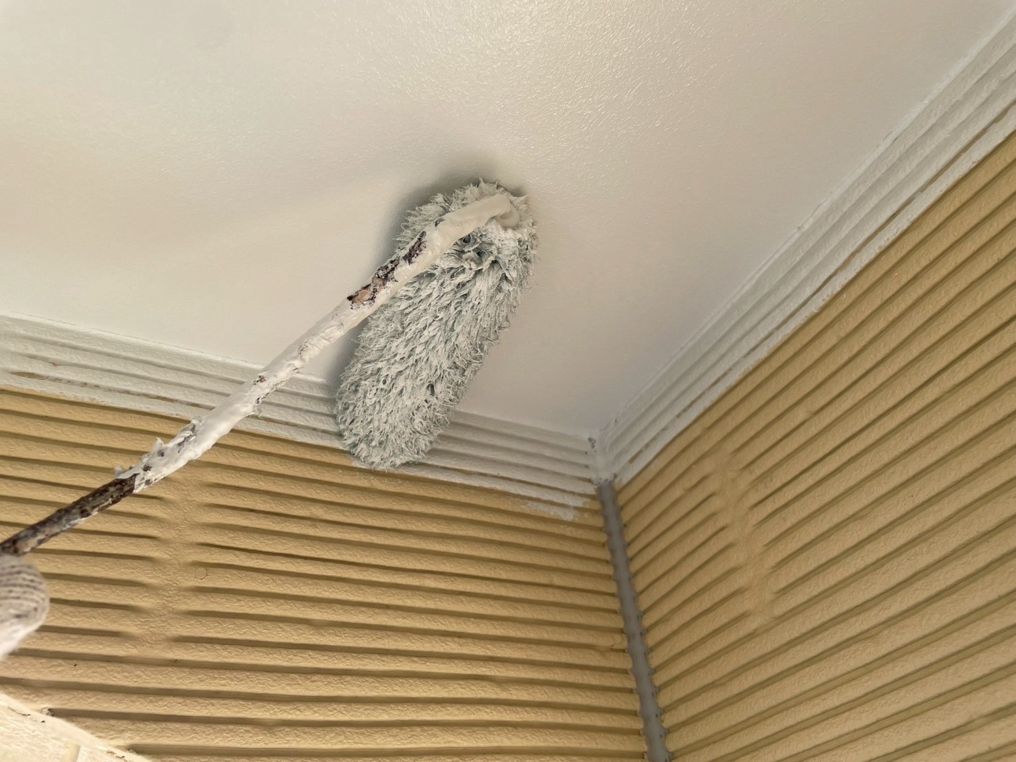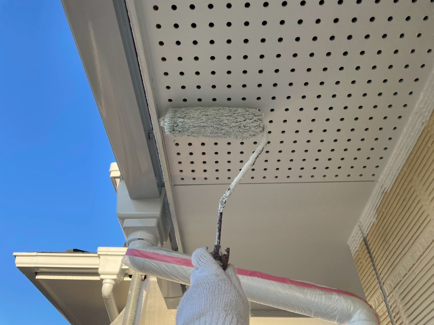 外壁・軒天・上塗り仕上げ:ケンエースG-Ⅱ(防カビ剤入り)の施工です。