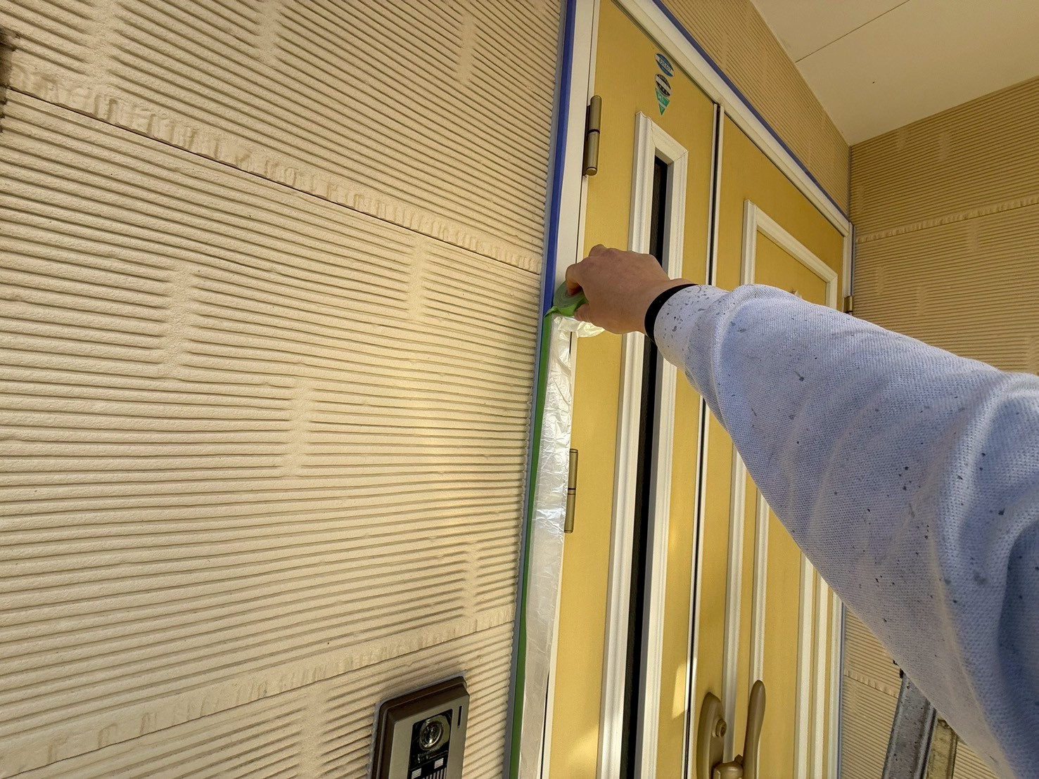 外壁・玄関廻り(ドア、開閉が出来るように貼り上げます)の養生施工です。