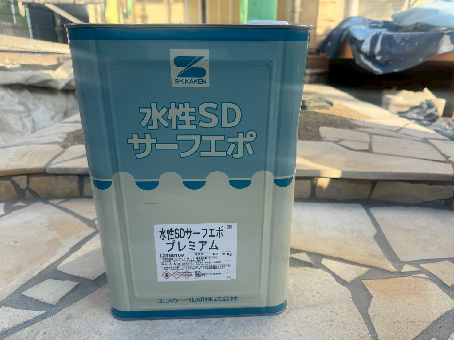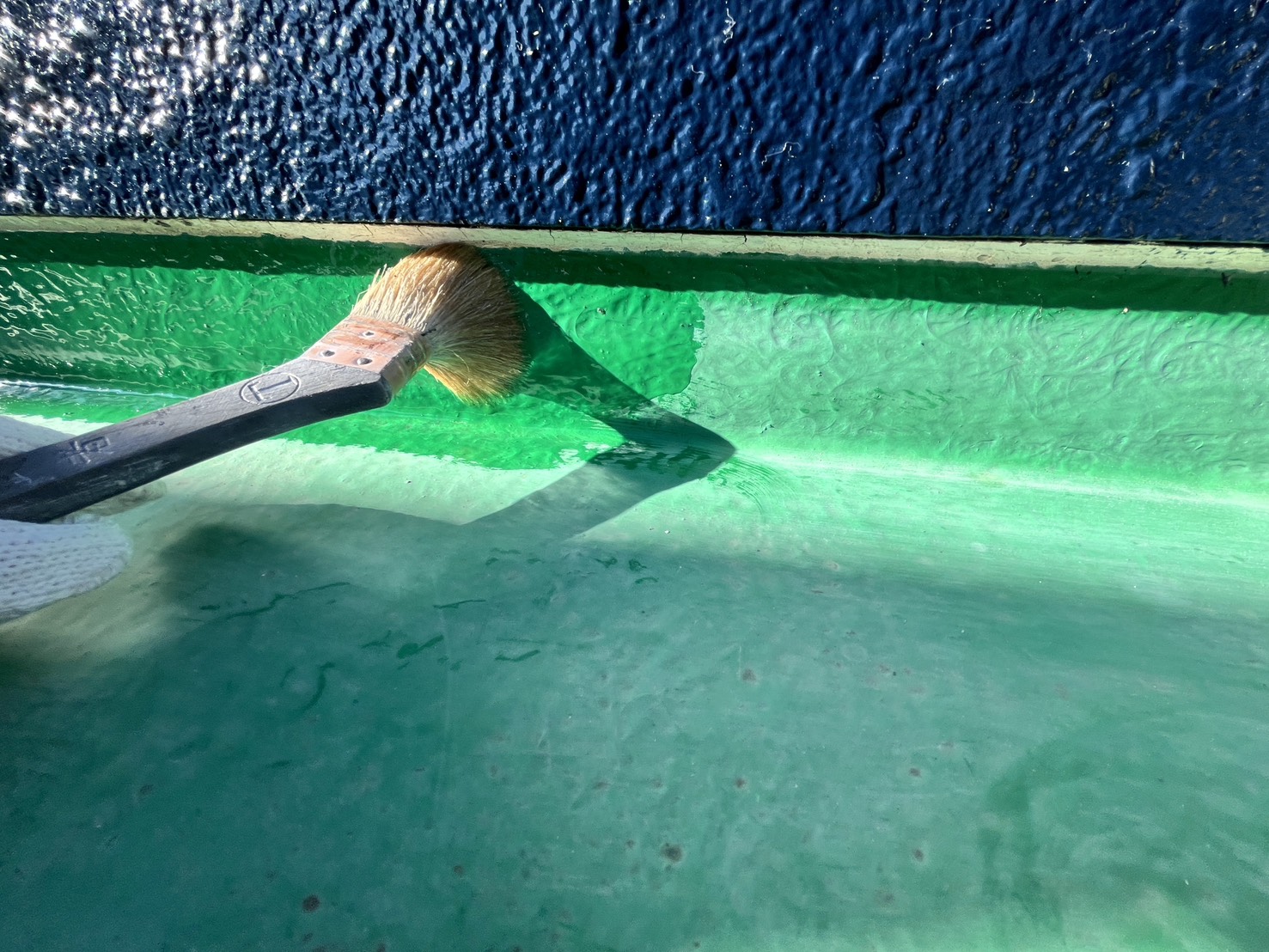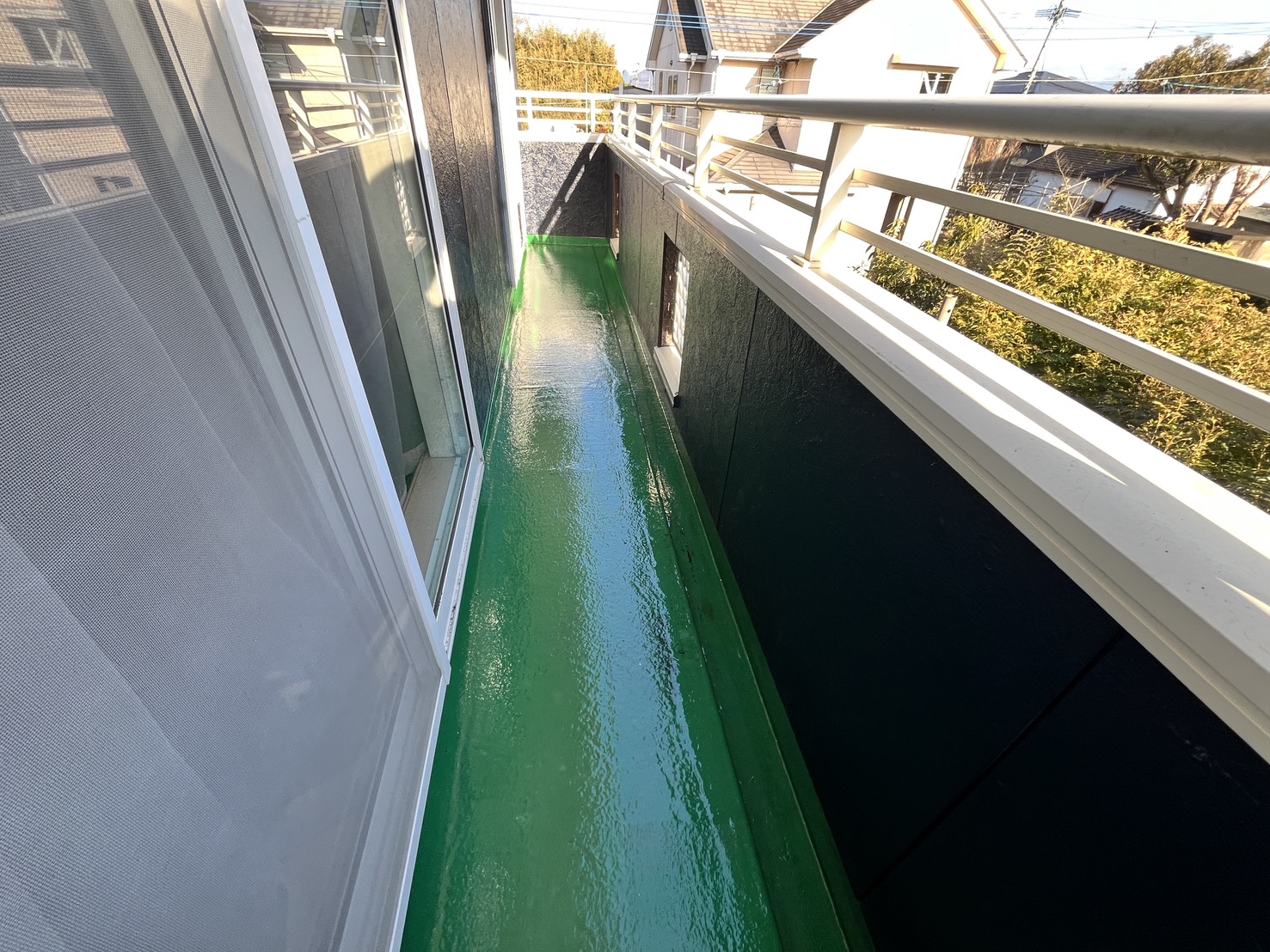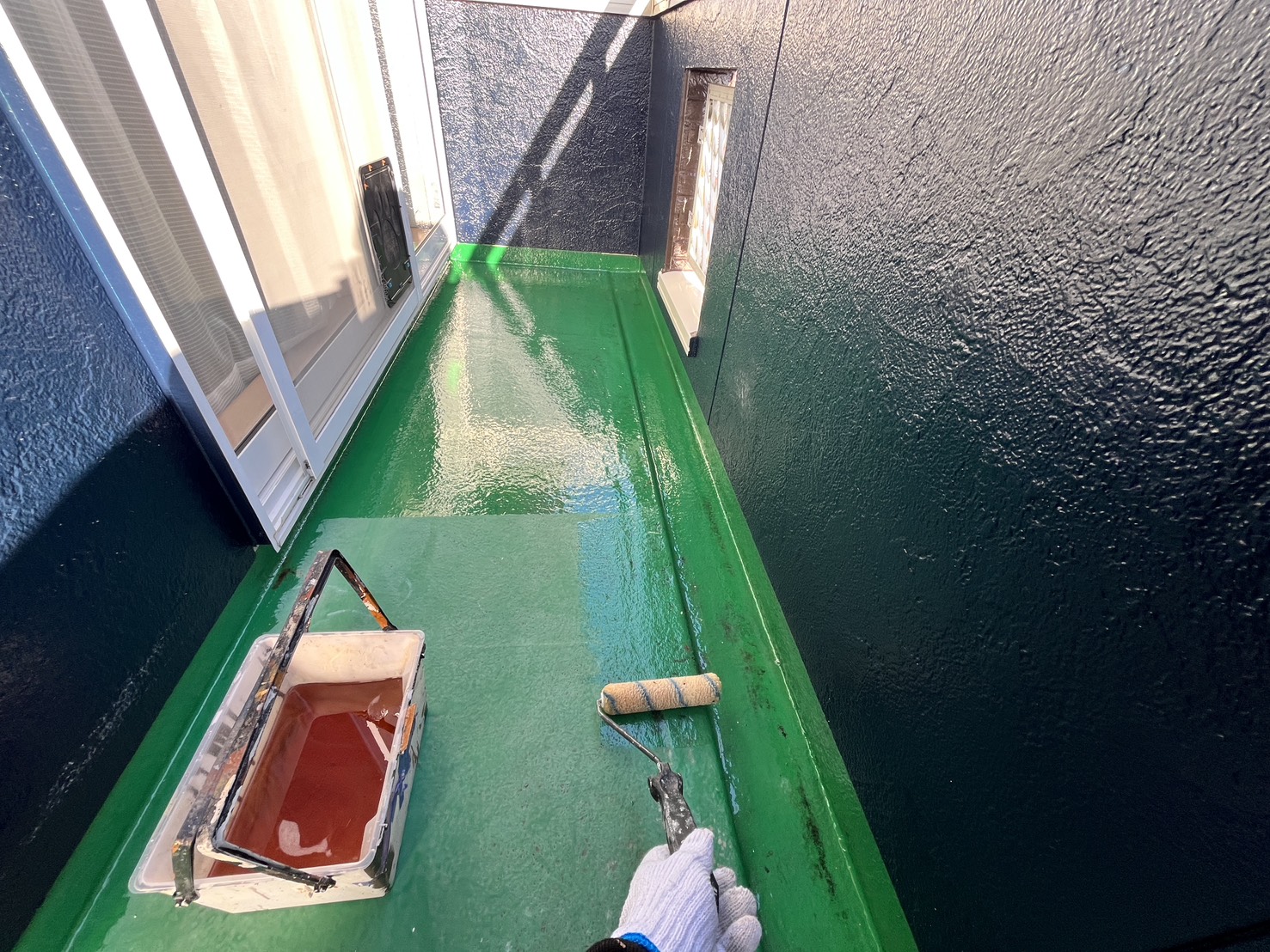 外壁・2Fベランダ床面・専用プライマー(接着剤)のローラー塗り施工:しっかり乾燥させます。