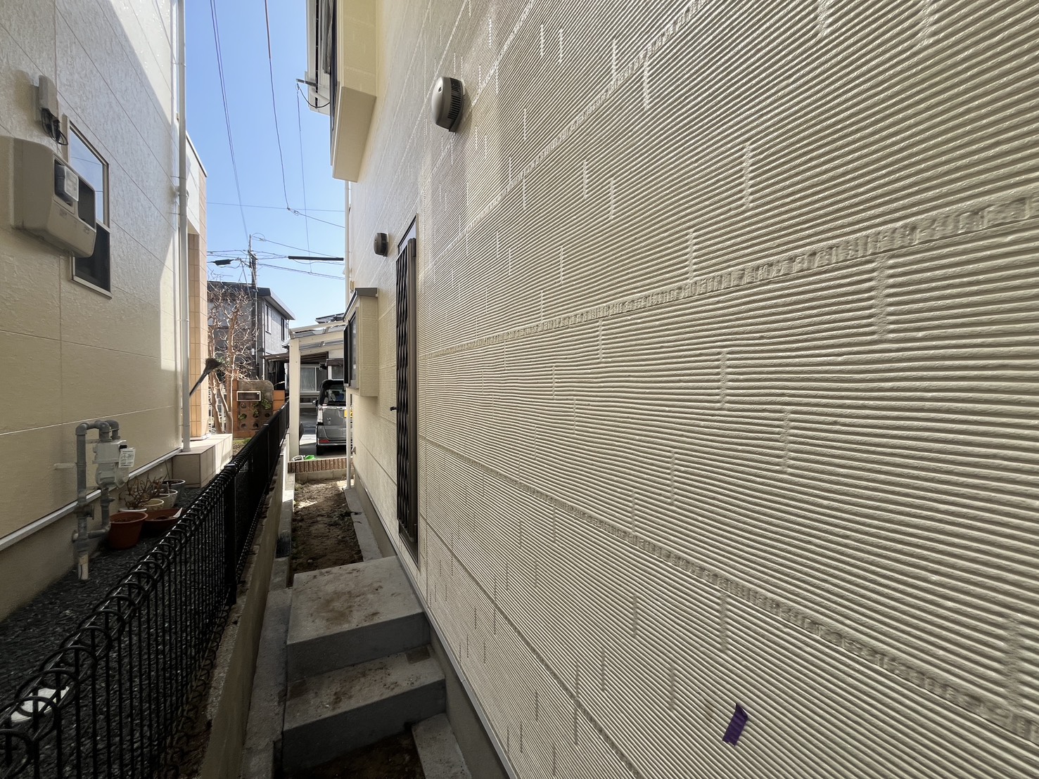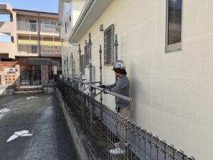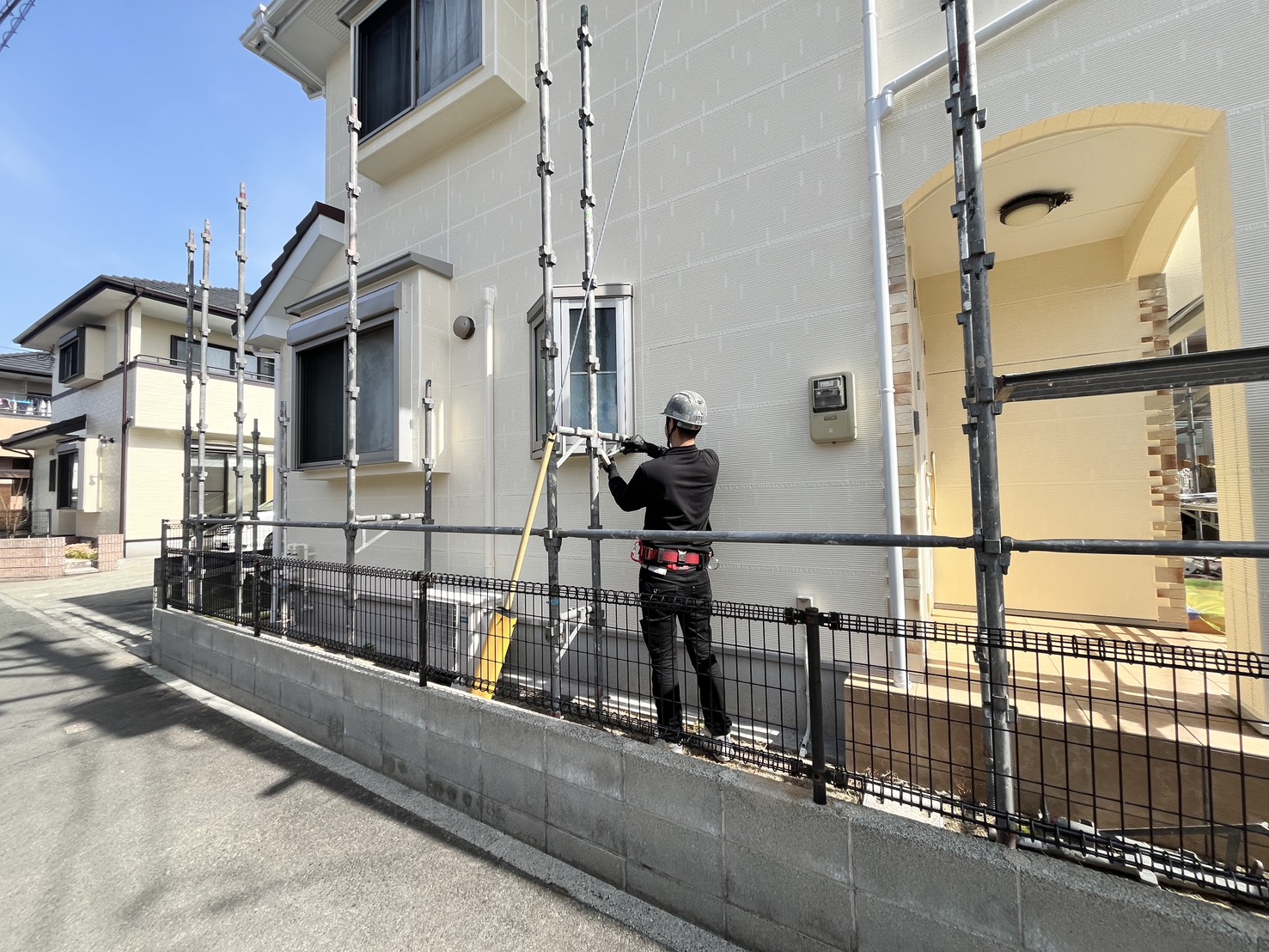 外壁・屋根・付帯部・その他:1F北面側・最終確認検査後、架設足場解体・手摺り・縦柱の施工です。