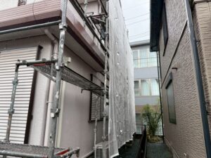 外壁・東面側・架設足場組み上げ作業:飛散防止シートの取り付けです。
